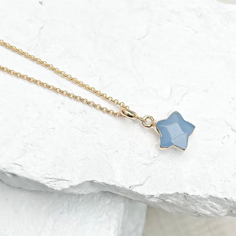 Agate Star Gold Plated Necklace. Deep and tranquil, this Agate blue-grey Star Necklace features a star-shaped pendant (17x13mm) on an 18k gold-plated chain. Grey agate is a stone of balance and courage, believed to ground restless energy to its wearer. A meaningful piece for Virgo, Taurus, and Capricorn signs. Crafted from ethically-sourced semi-precious gemstones, these pieces make ideal gifts for a loved one or a well-deserved treat for yourself.