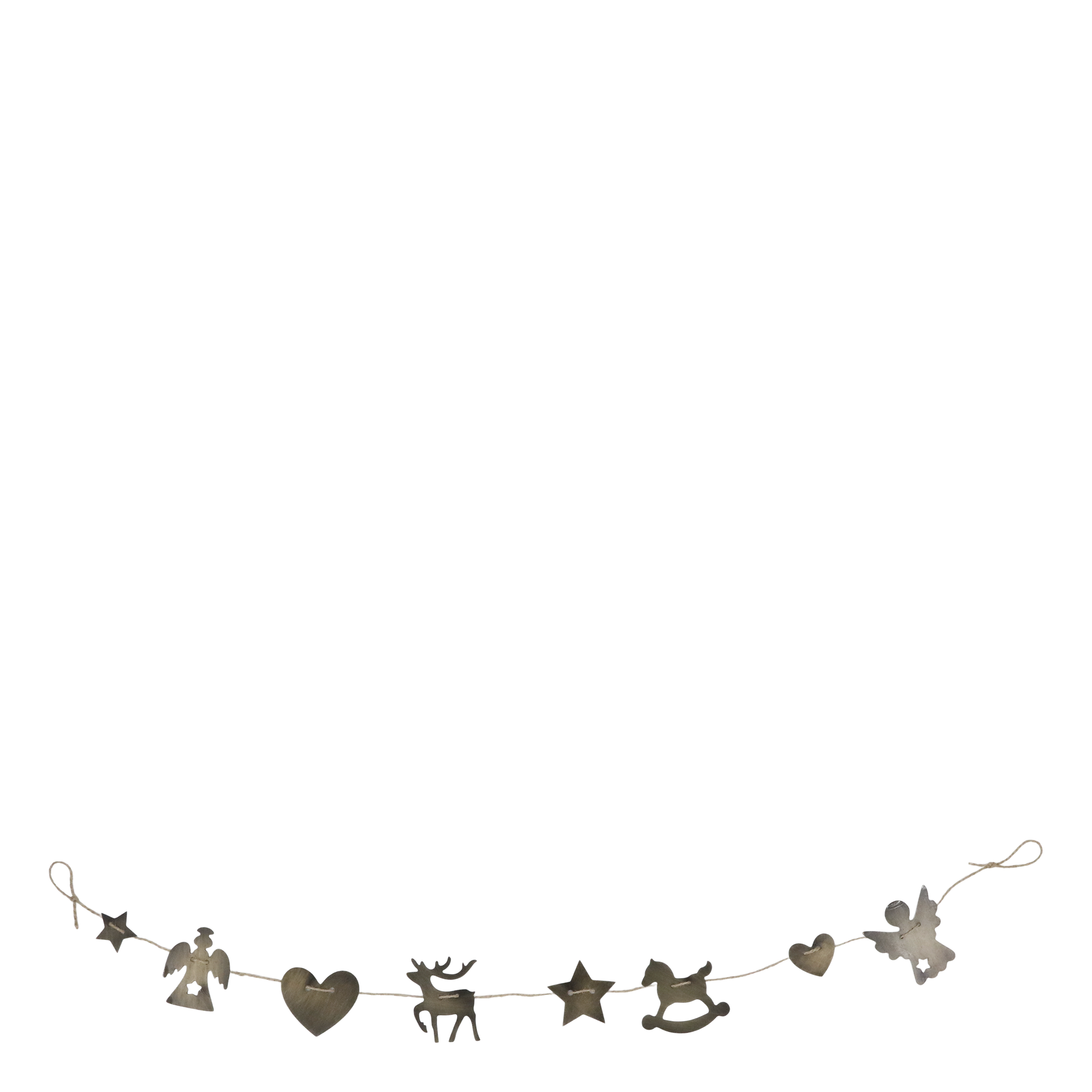 Antiqued Brass Christmas Garland. Crafted from iron in an antiqued brass colour, this garland features 8 Christmas designs on twine. Adorn a mantle or shelf with this subtle, festive decoration.