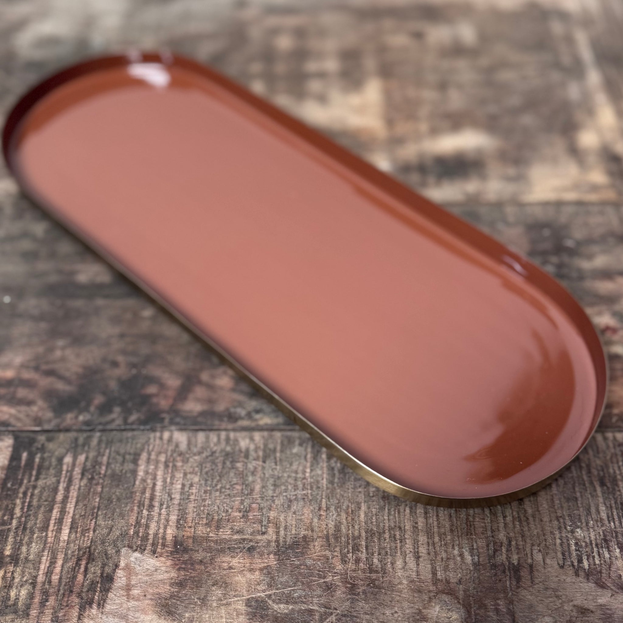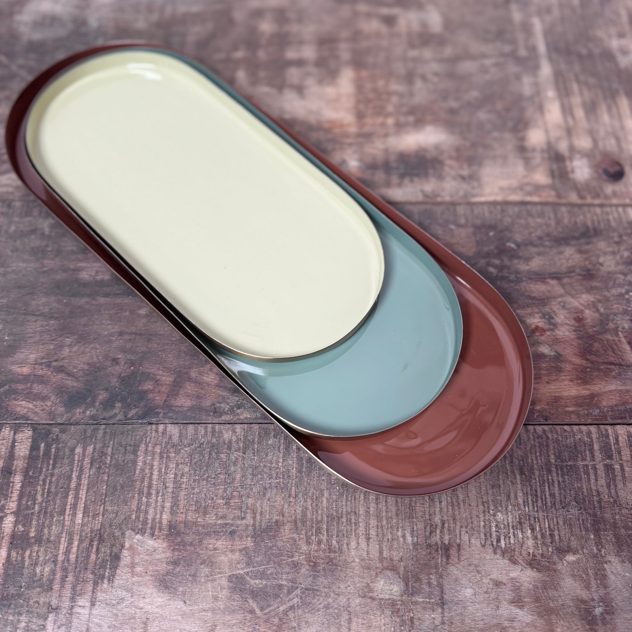 Block Colour Oval Trays. Available in three sizes, sold individually. These trays featuring a on-trend block colour and brass design are crafted from coated metal. Use for serving, display or keeping trinkets and jewellery.