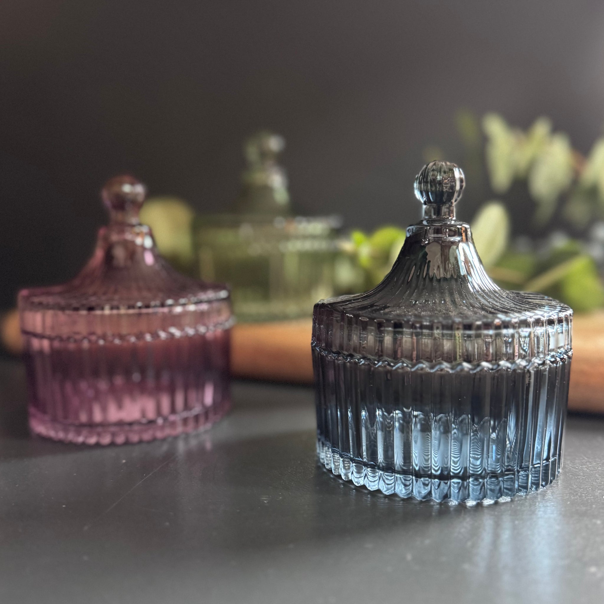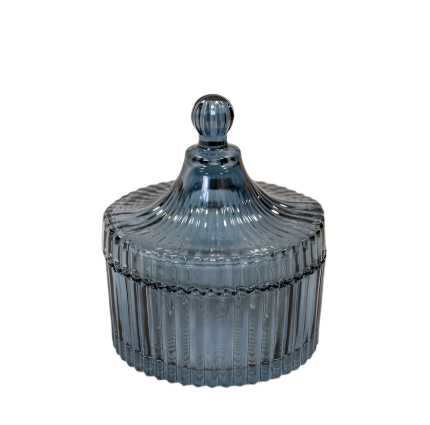 Blue Glass Jar with Lid. A pretty, decorative glass jar with lid, perfect for dressing table items such as cotton wool or jewellery'