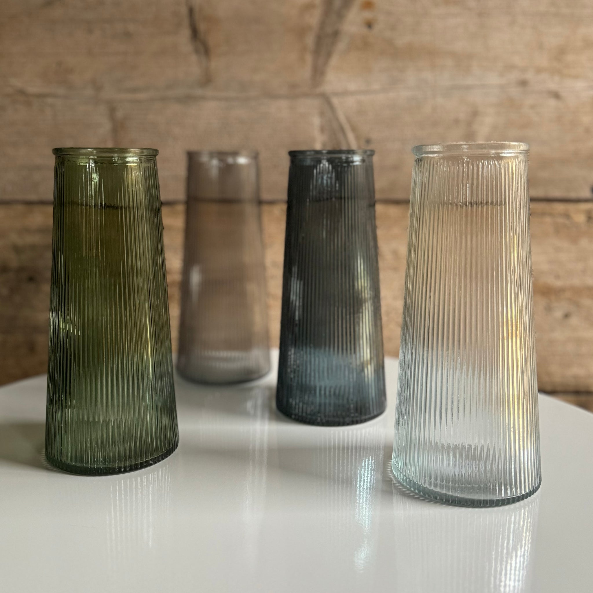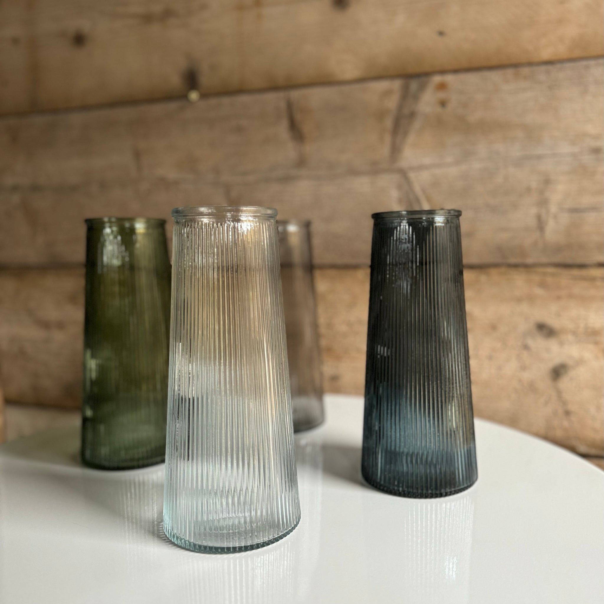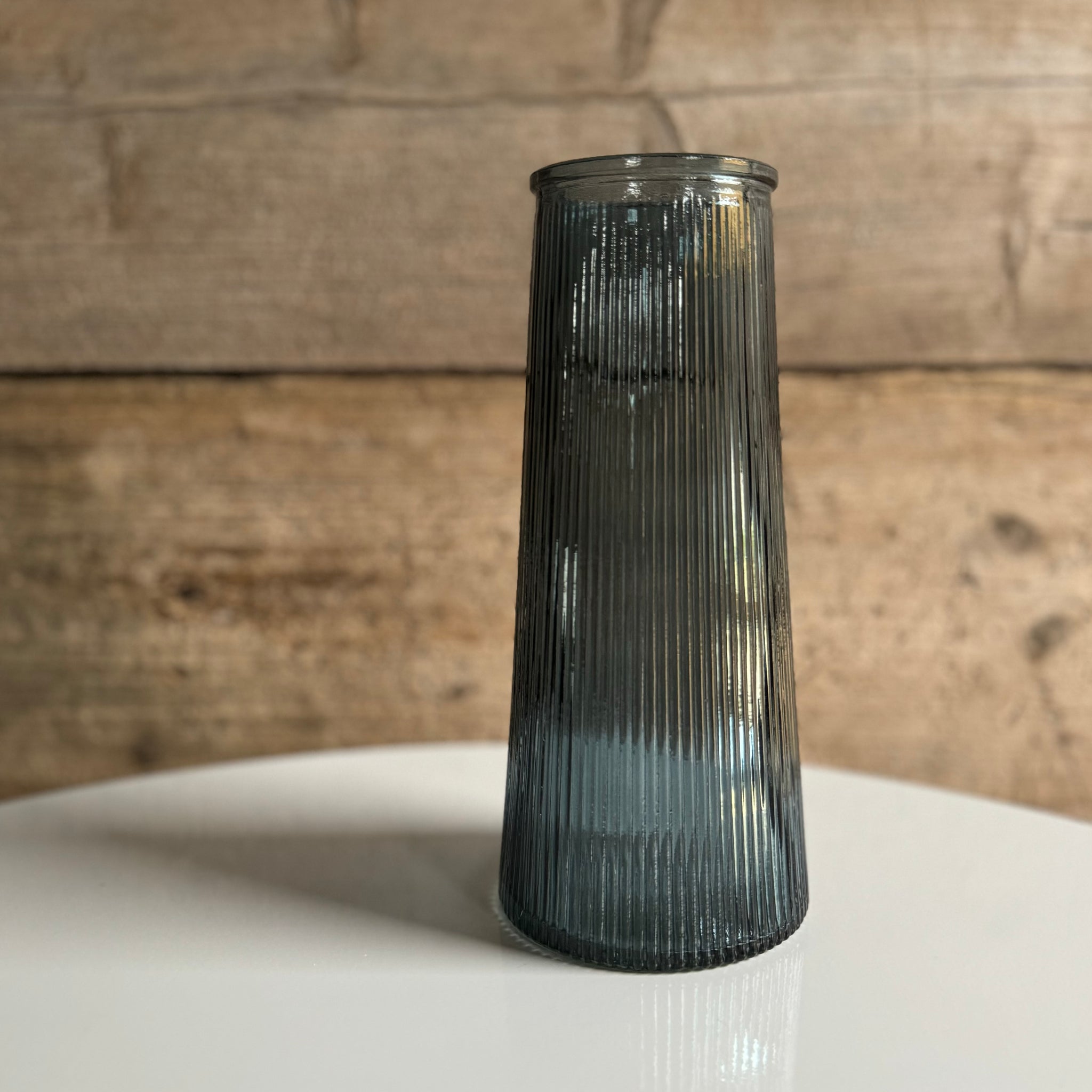 Blue Glass Ribbed Vase. These glass vases are the perfect mix of classic and contemporary with a sleek, ribbed design. Narrower at the neck, they keep your blooms looking neat. Makes a great housewarming or Mother's day gift combined with a bouquet of flowers.