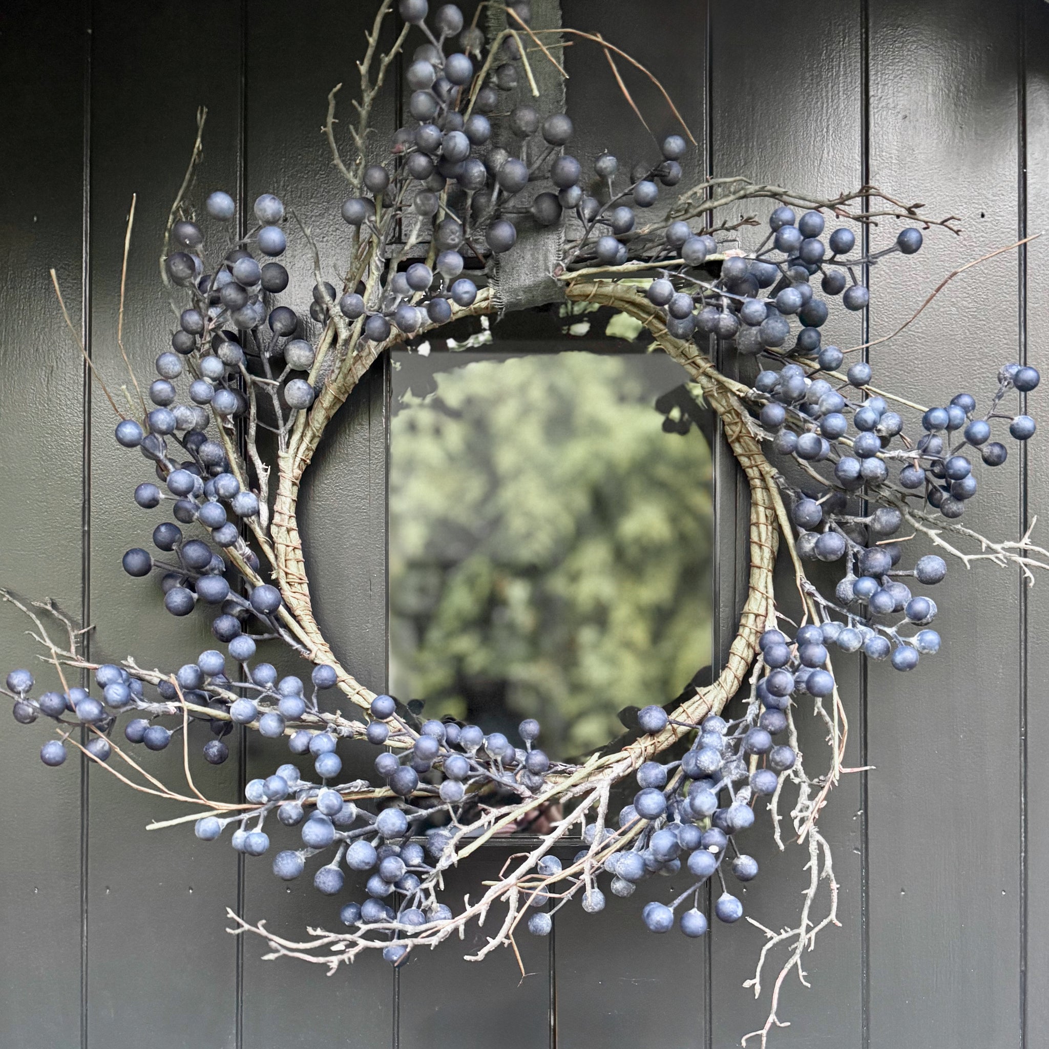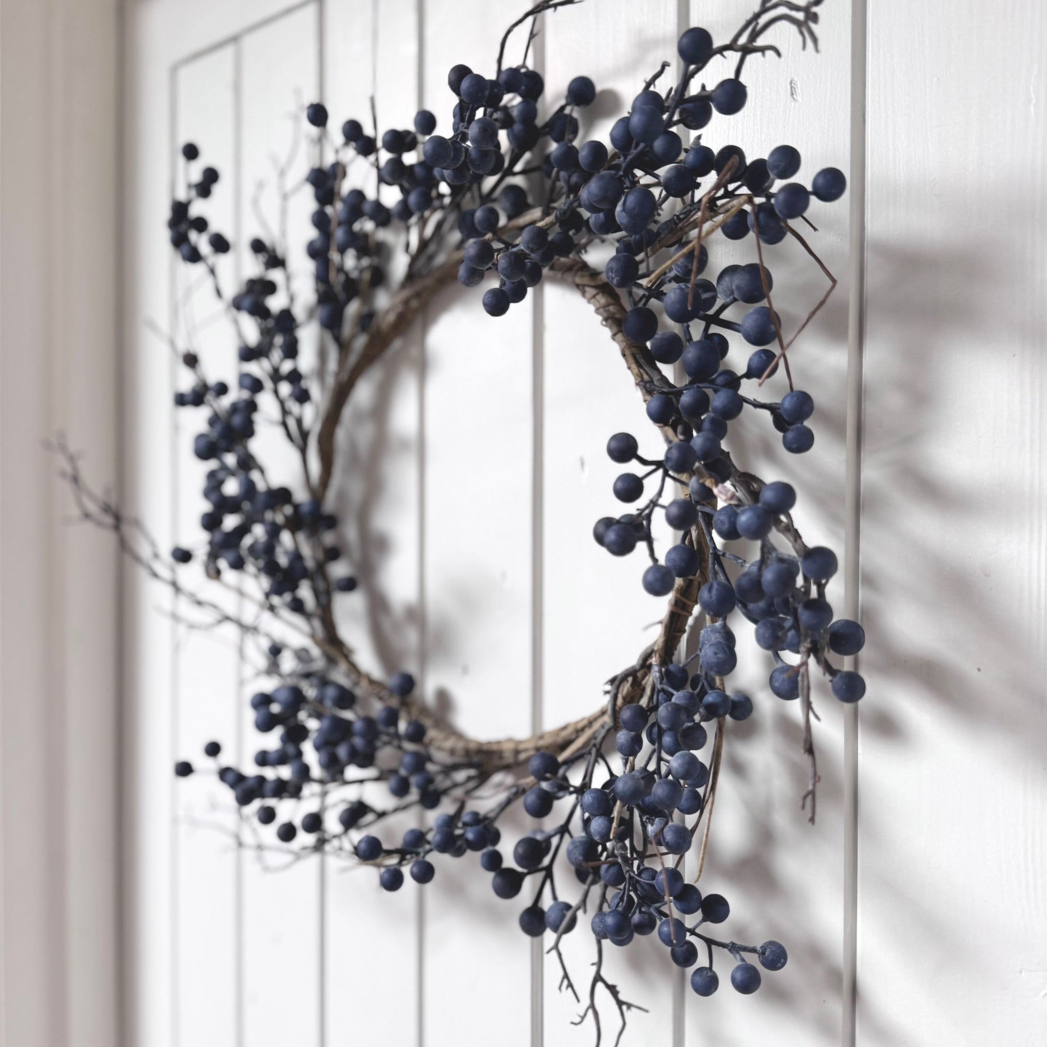 Blueberry Wreath. This simple wreath can be left unadorned and pared back, or you can add your own lights and decorations. The soft, dusty blue colour of the blueberries adds a hint of colour to a scheme. Use all year round as a wreath on a wall or door, or lay flat and use as a centrepiece around a vase or candles