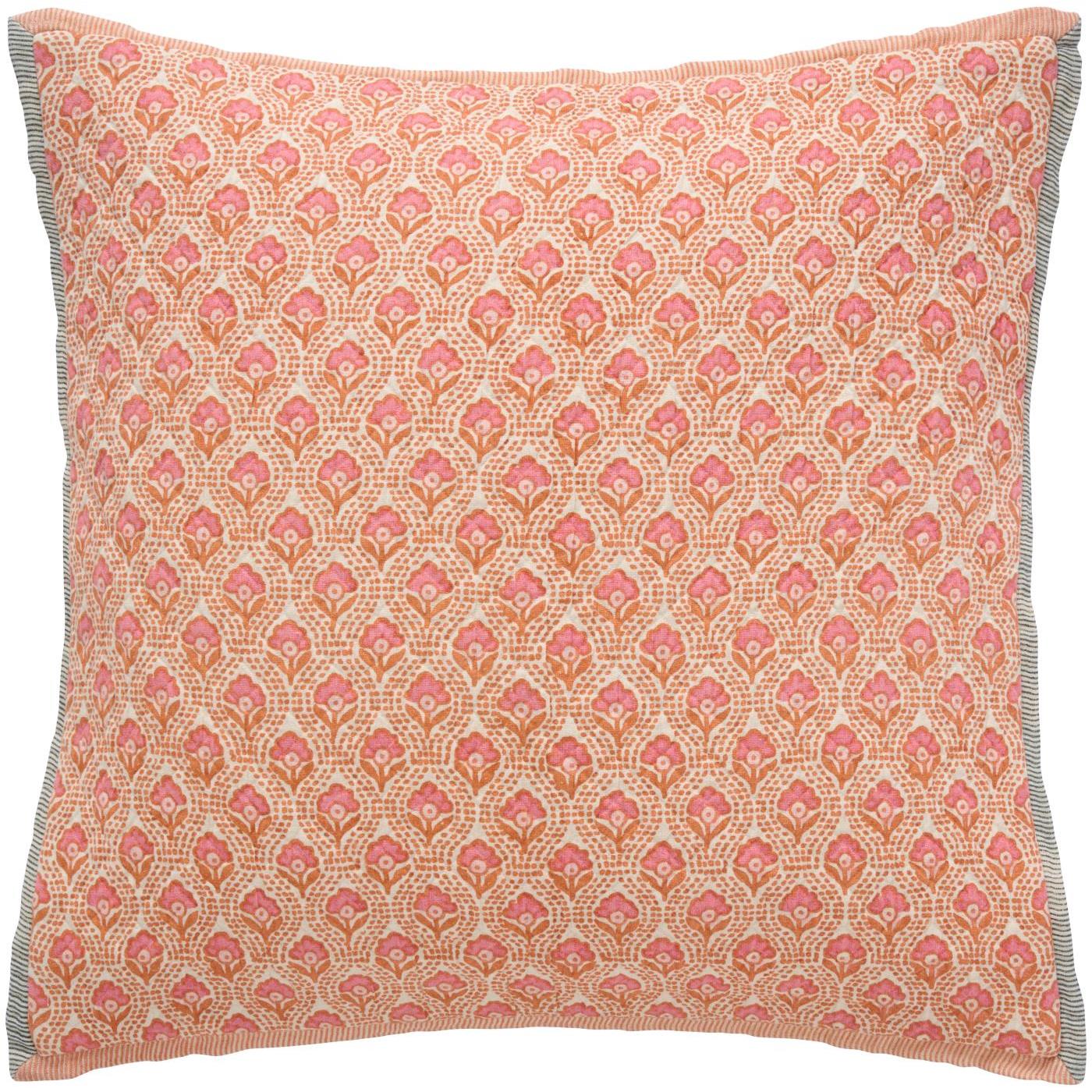 Coral print cushion in a square shape. A 100% double-woven cotton cushion with a decorative print on the front and a plain back. The beautiful pattern adds character and atmosphere to your interior. Zip closure. Comes complete with feather inner. This new season colour is a soft yet bright coral pink shade.
