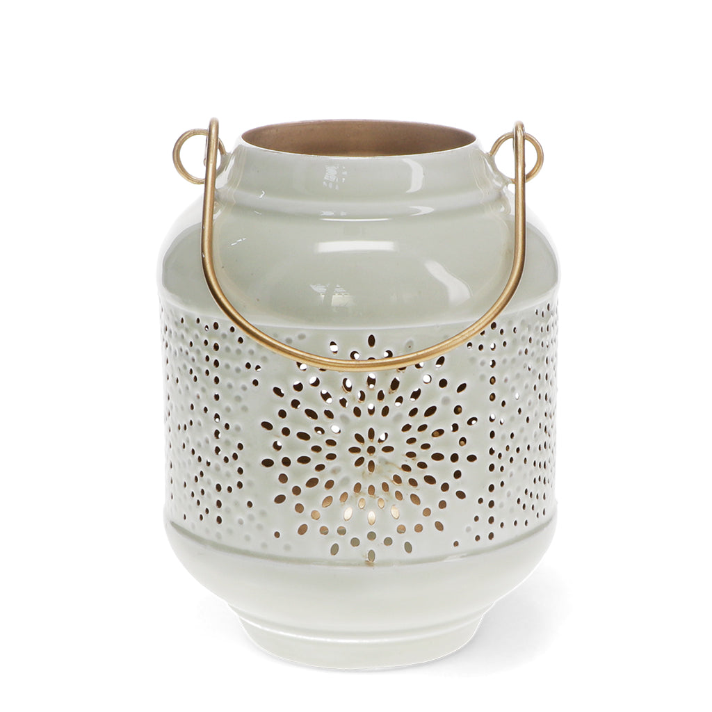 Enamel Tealight Lantern. Decorative cast metal lantern for tealights, with colourful enamel finish on the exterior, brass-coloured interior and brass-coloured handle/hanging loop. Can be hung up or placed on a surface in the home or garden. The beautiful perforated pattern will illuminate the space with stunning patterns of light. Sold individually and available in a choice of 5 colours.