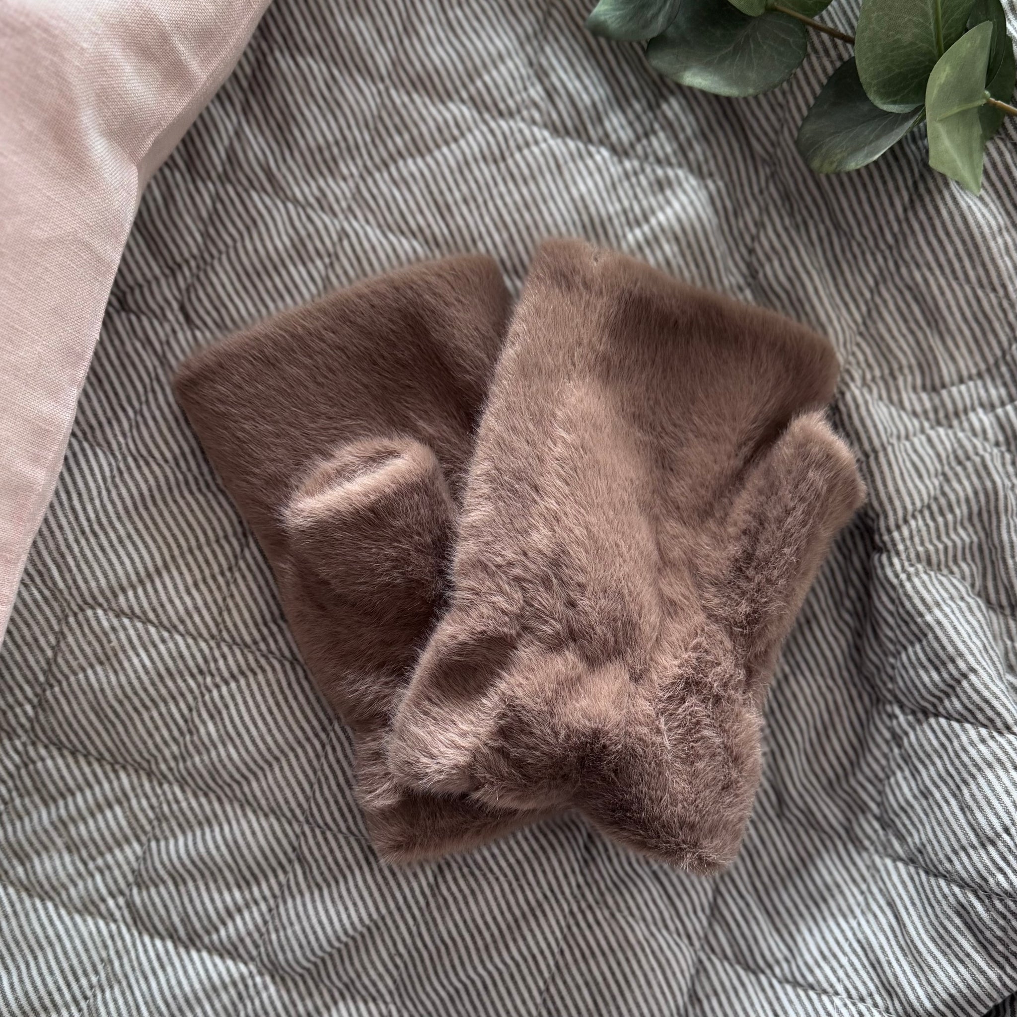 Faux Fur Fingerless Mittens In Mocha. These mittens are just so snuggly whilst looking and feeling elegant and stylish. Fingerless design leaves the hands with a warm and comfortable fit and leaves fingers free for flexability.
