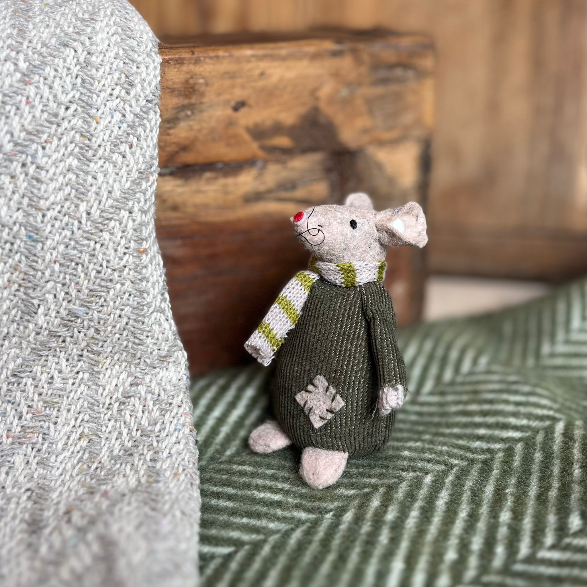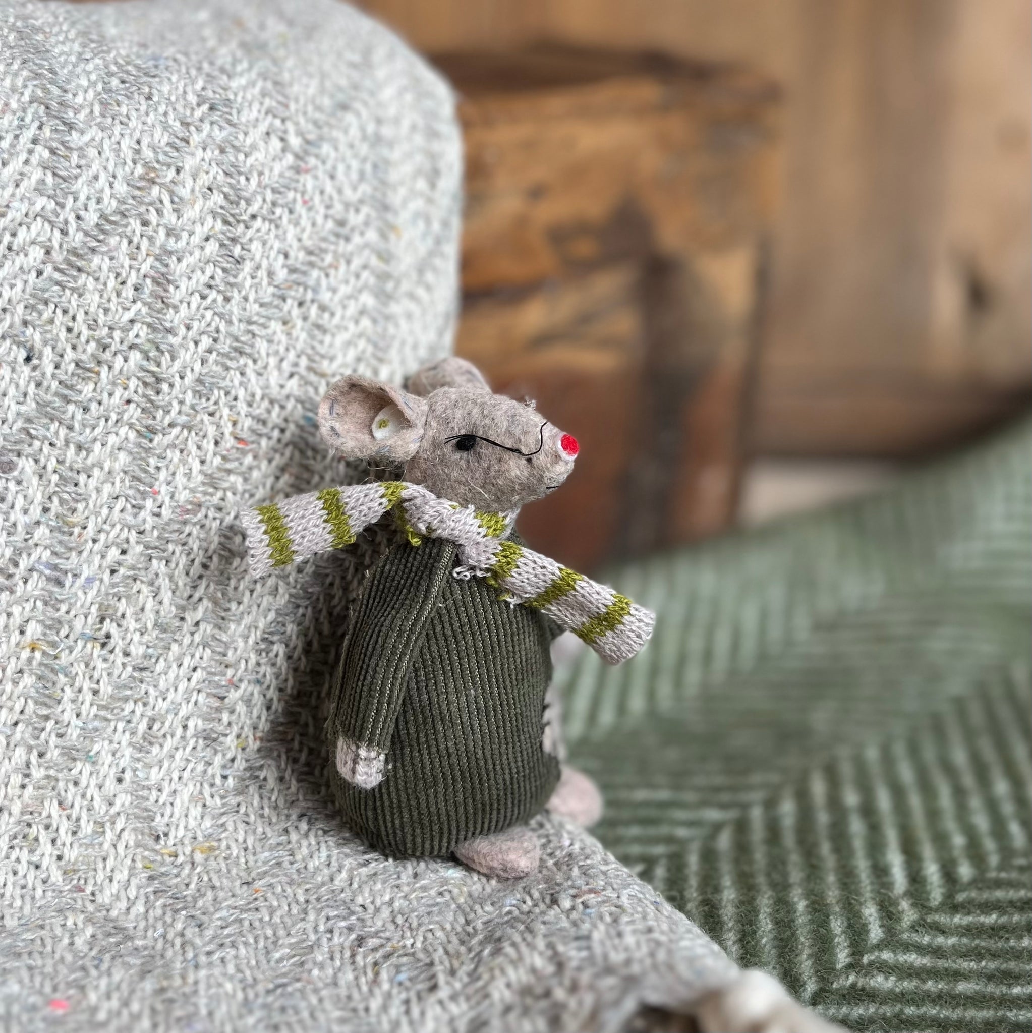 Felt Mouse in Green Cord. Delightful little felt mouse decoration wearing green cord tunic and a stripey knitted scarf, perfect for a traditional family Christmas scheme.