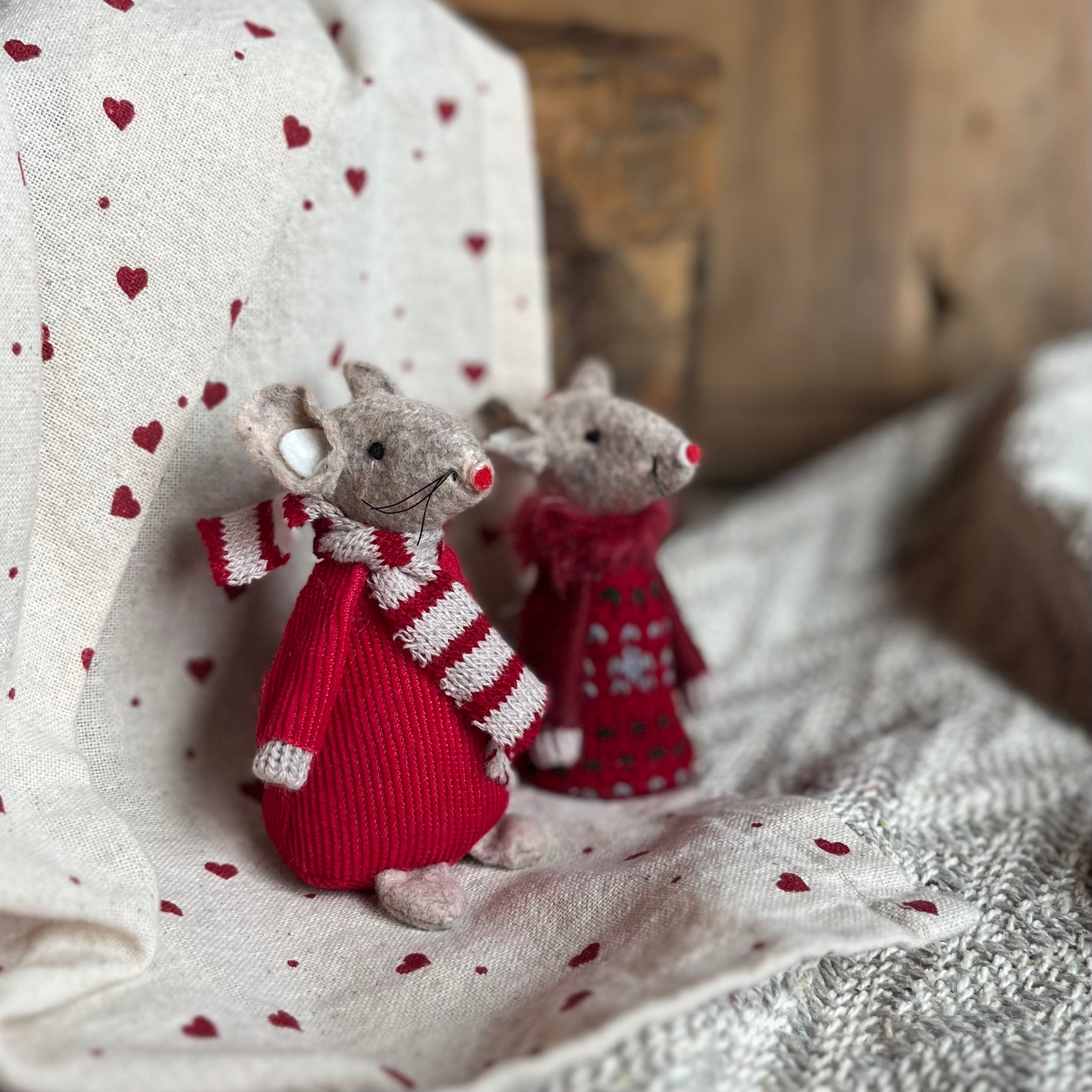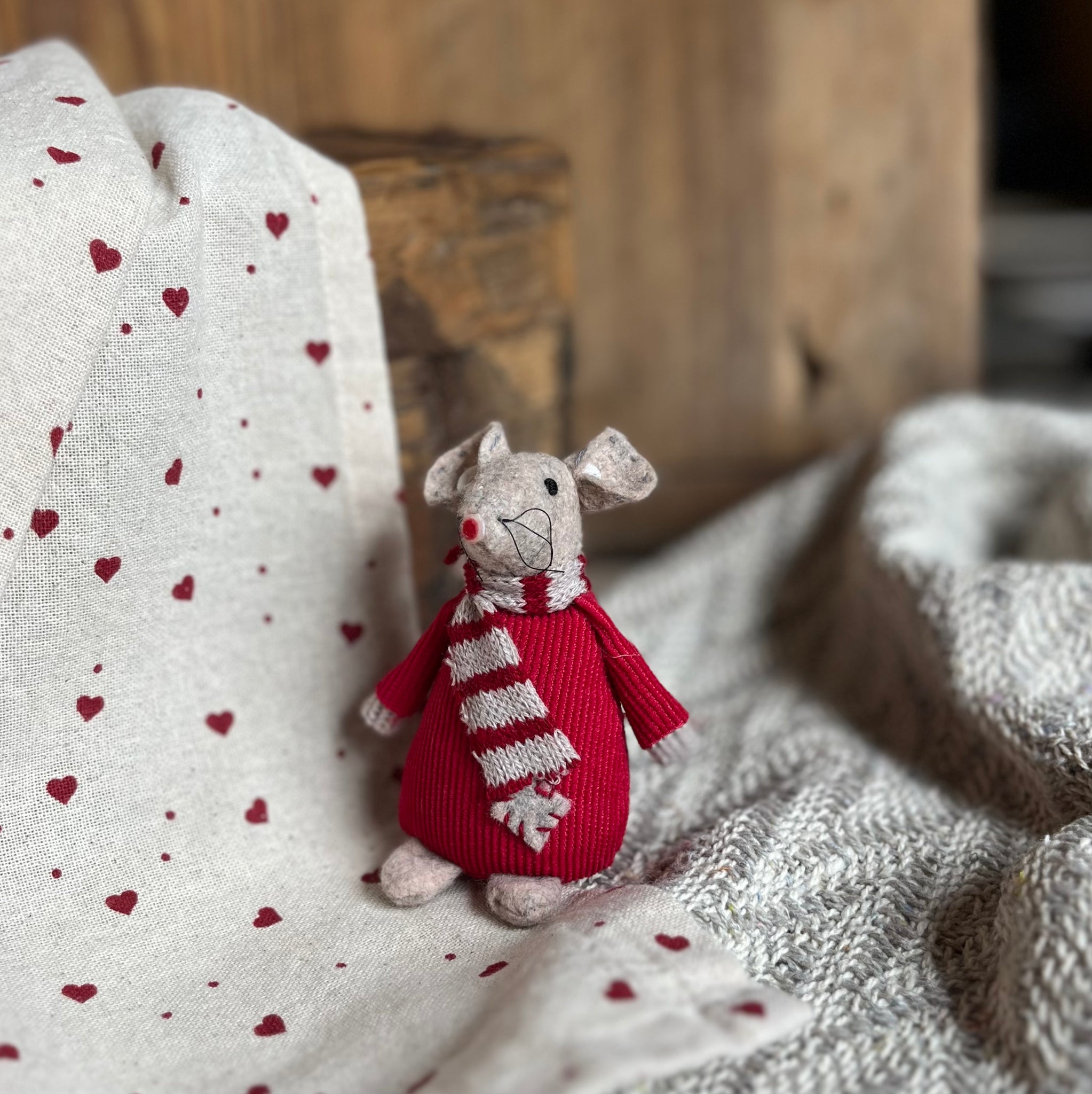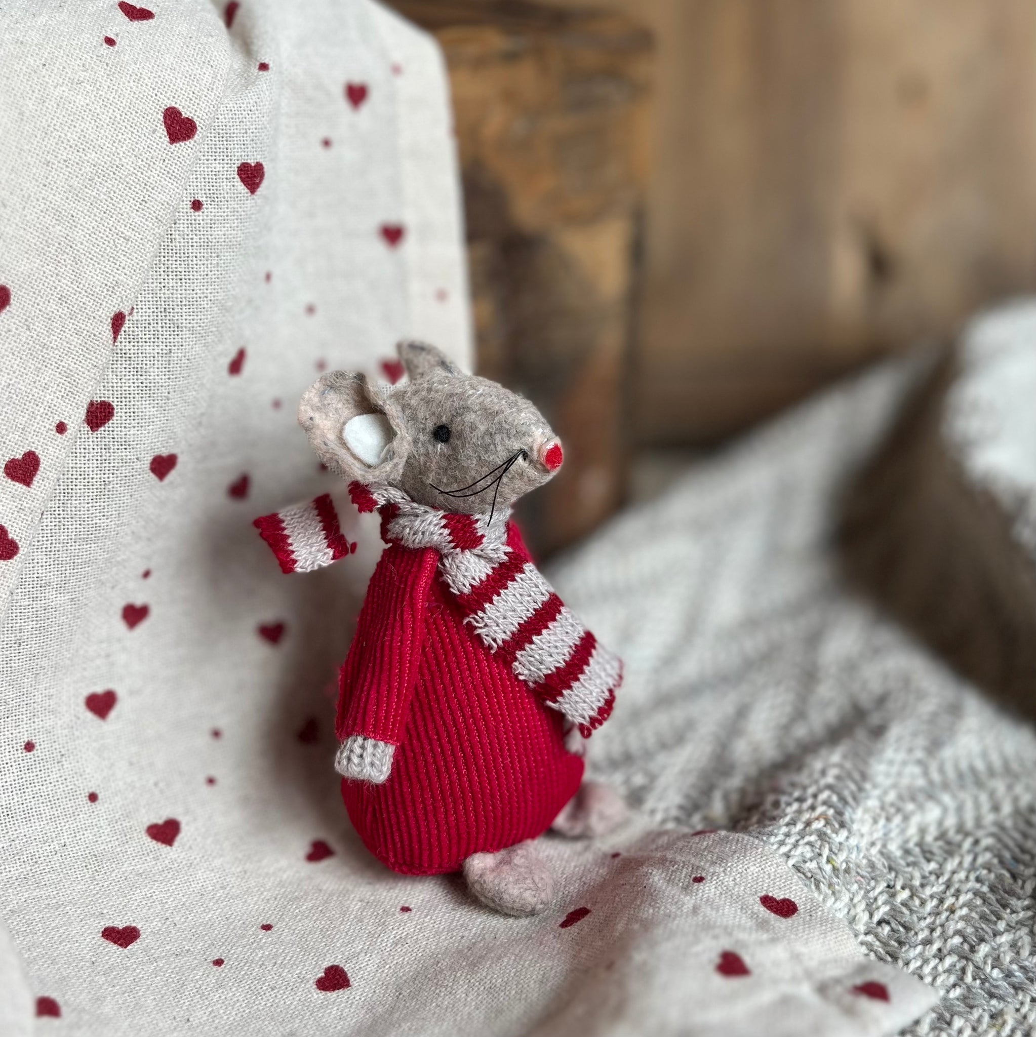 Felt Mouse in Red Cord. Delightful little felt mouse decoration wearing red cord tunic and a stripey knitted scarf, perfect for a traditional family Christmas scheme.