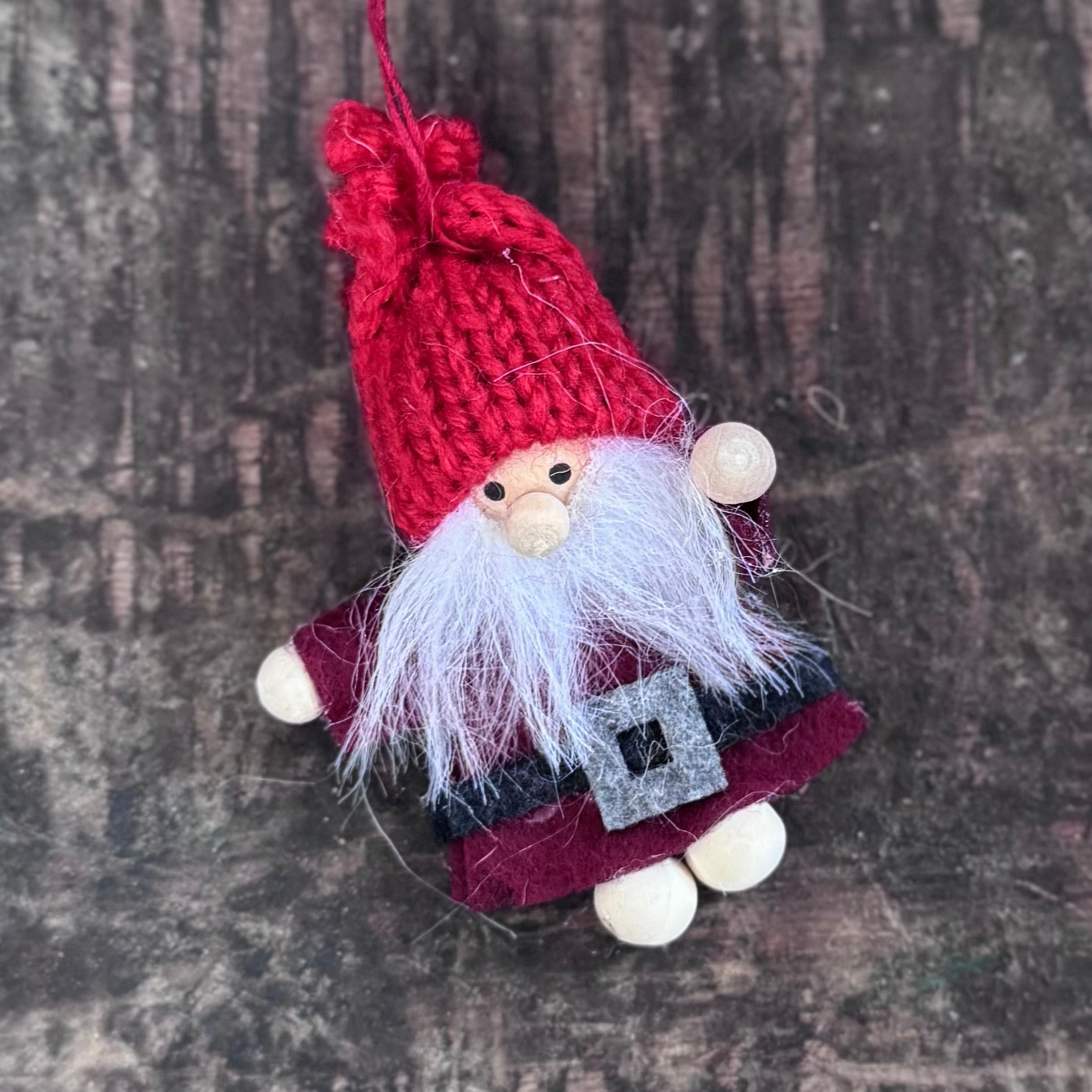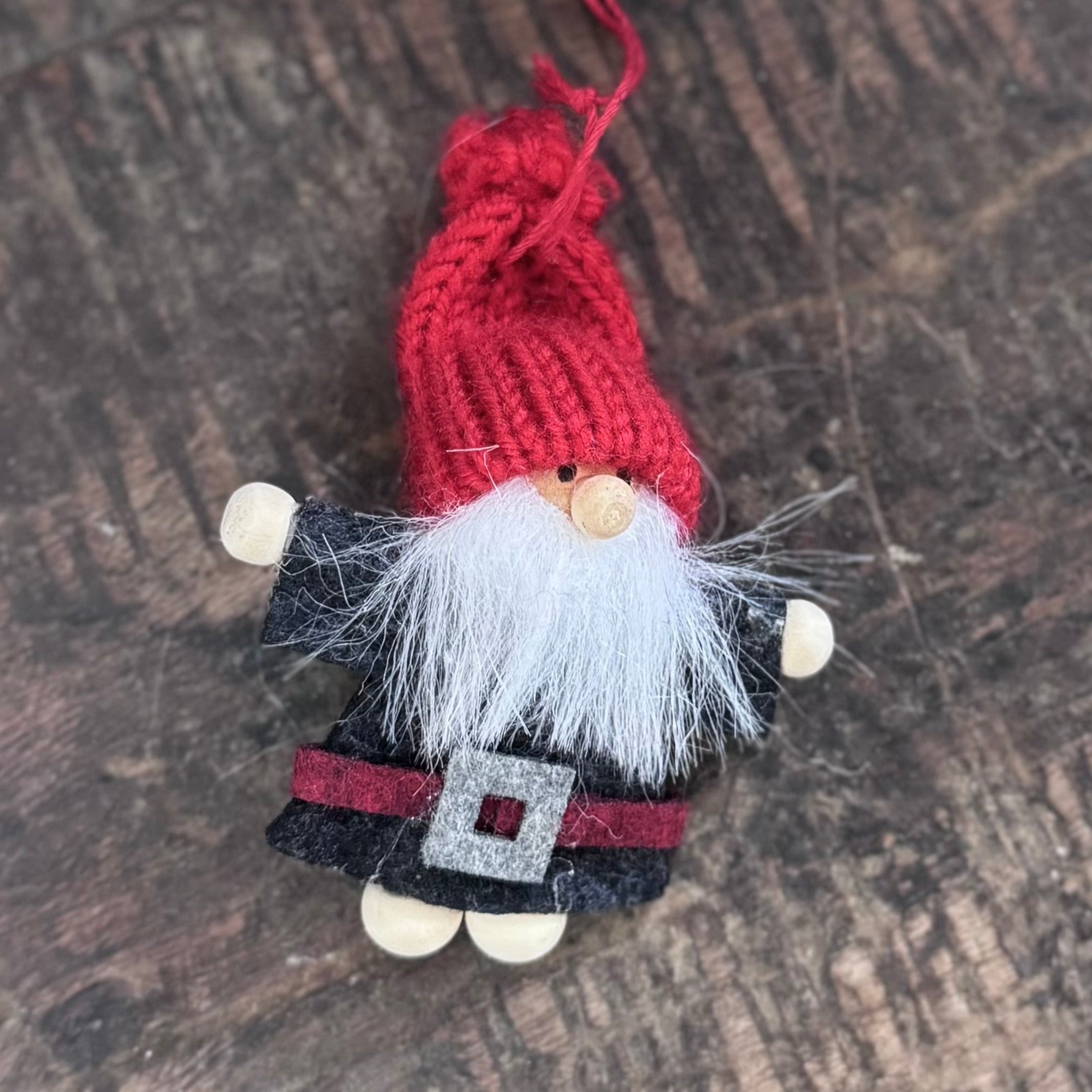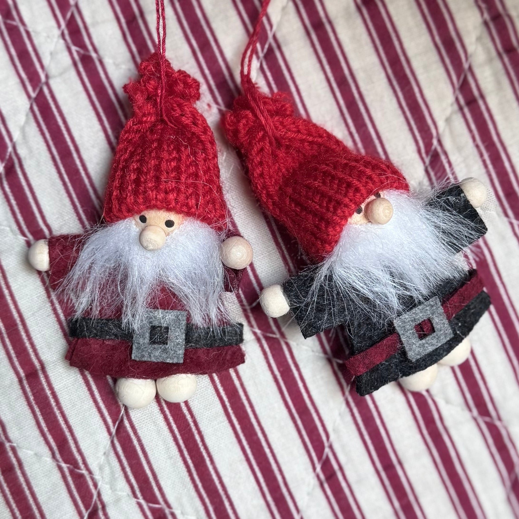 Felt Santa Tree Decorations. Sold individually and available in two colour ways, these little felt Santas with fluffy beards and red knitted hats will make a lovely addition to your tree this year. Choose from red or charcoal
