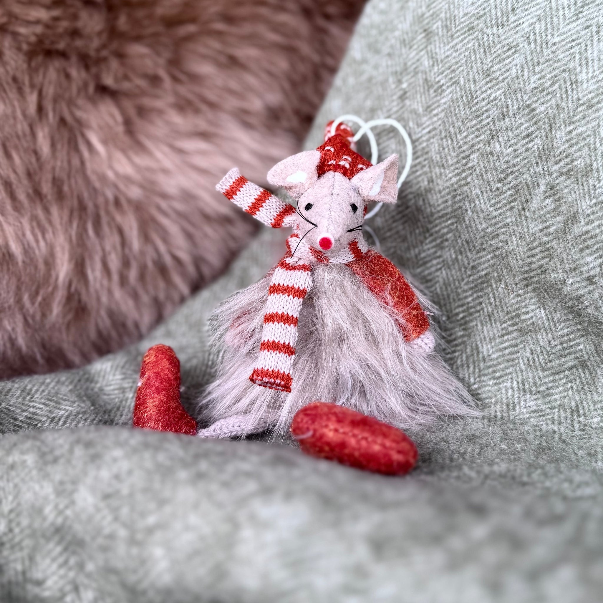Fluffy Mouse in Dress decoration. Dressed in a fluffy beige faux fur dress and woolly stockings with contrasting burnt orange hat and boots, this is an adorable decoration.