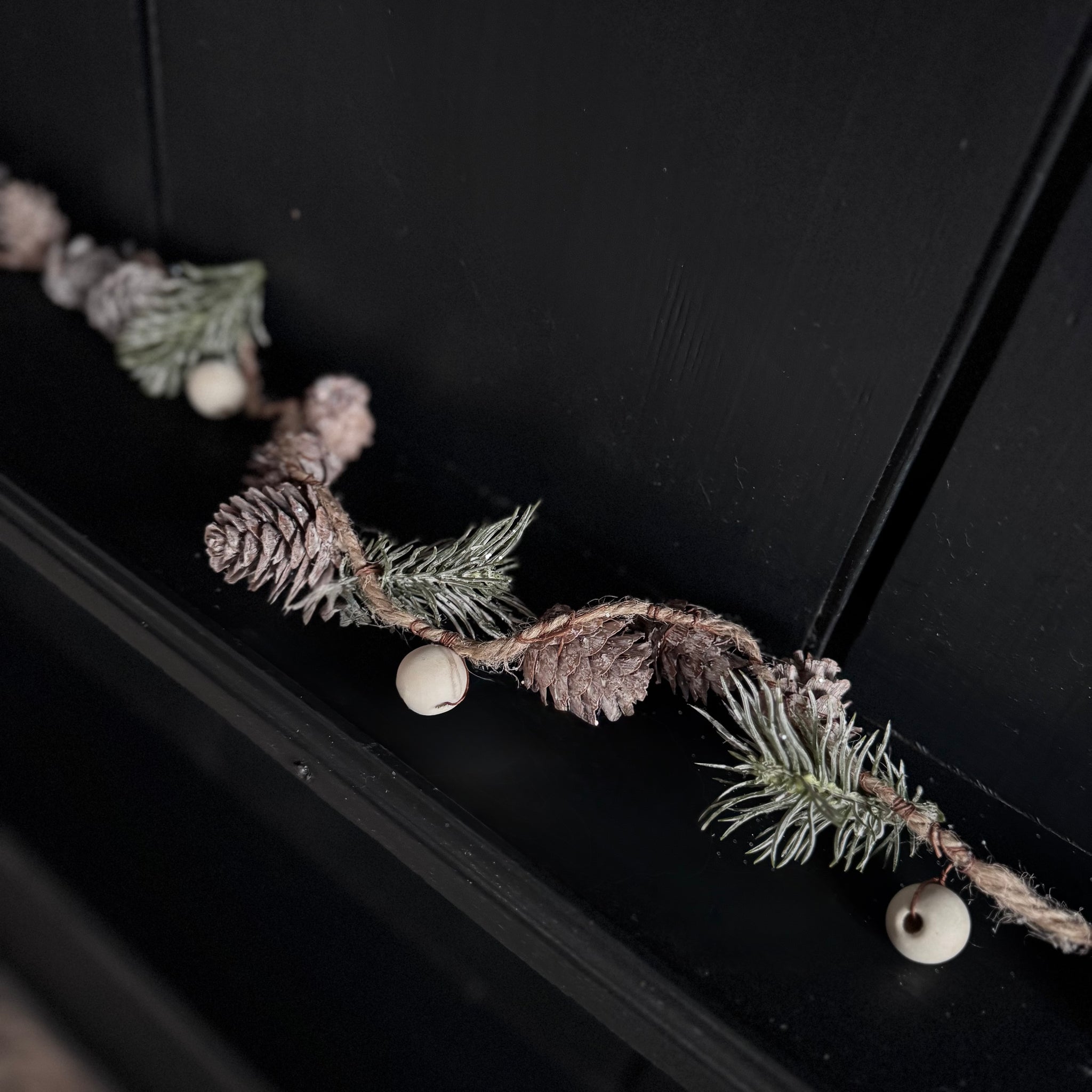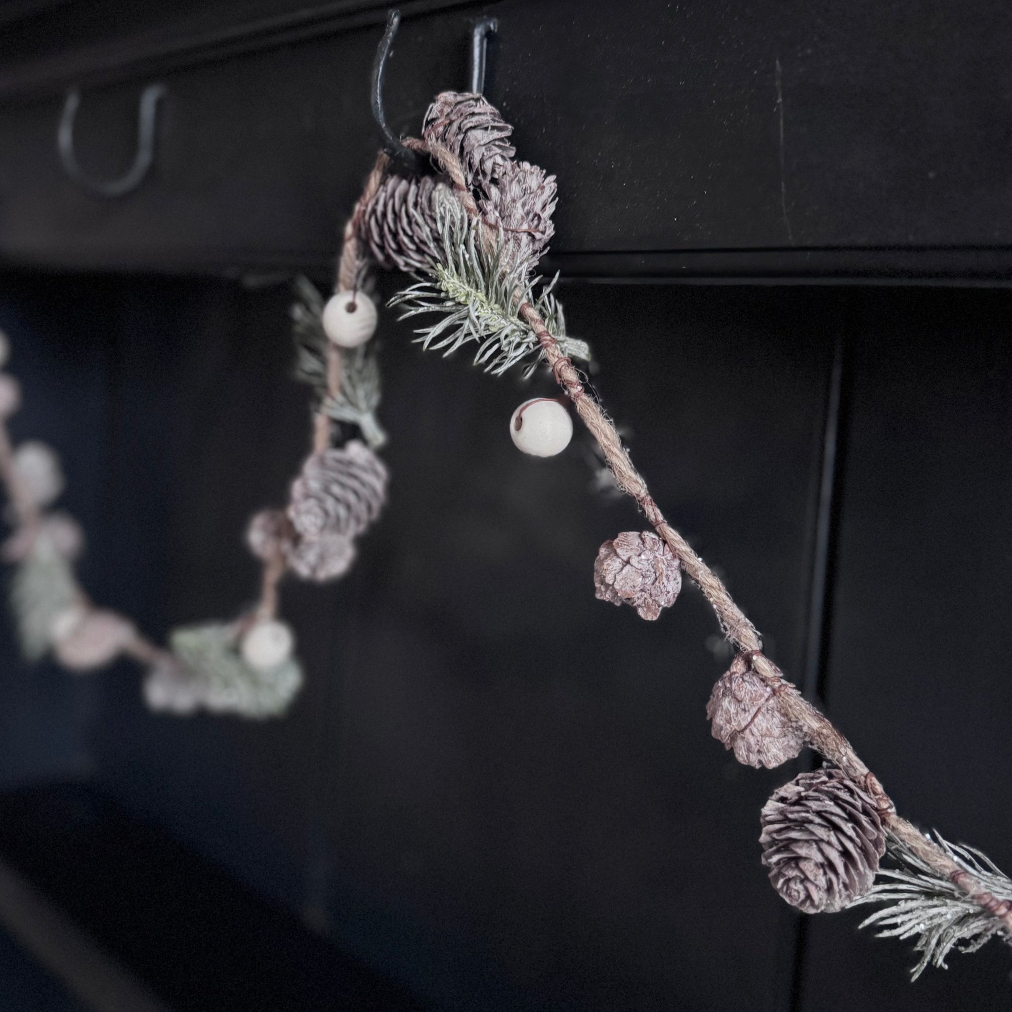 Frosted Pine Cone and Spruce Garland. A lovely rustic garland which can be used throughout Autumn and Winter to adorn your home. Crafted from real pine cones and faux spruce and white berries on twine with a delicate dusting of glitter for some subtle, festive sparkle.