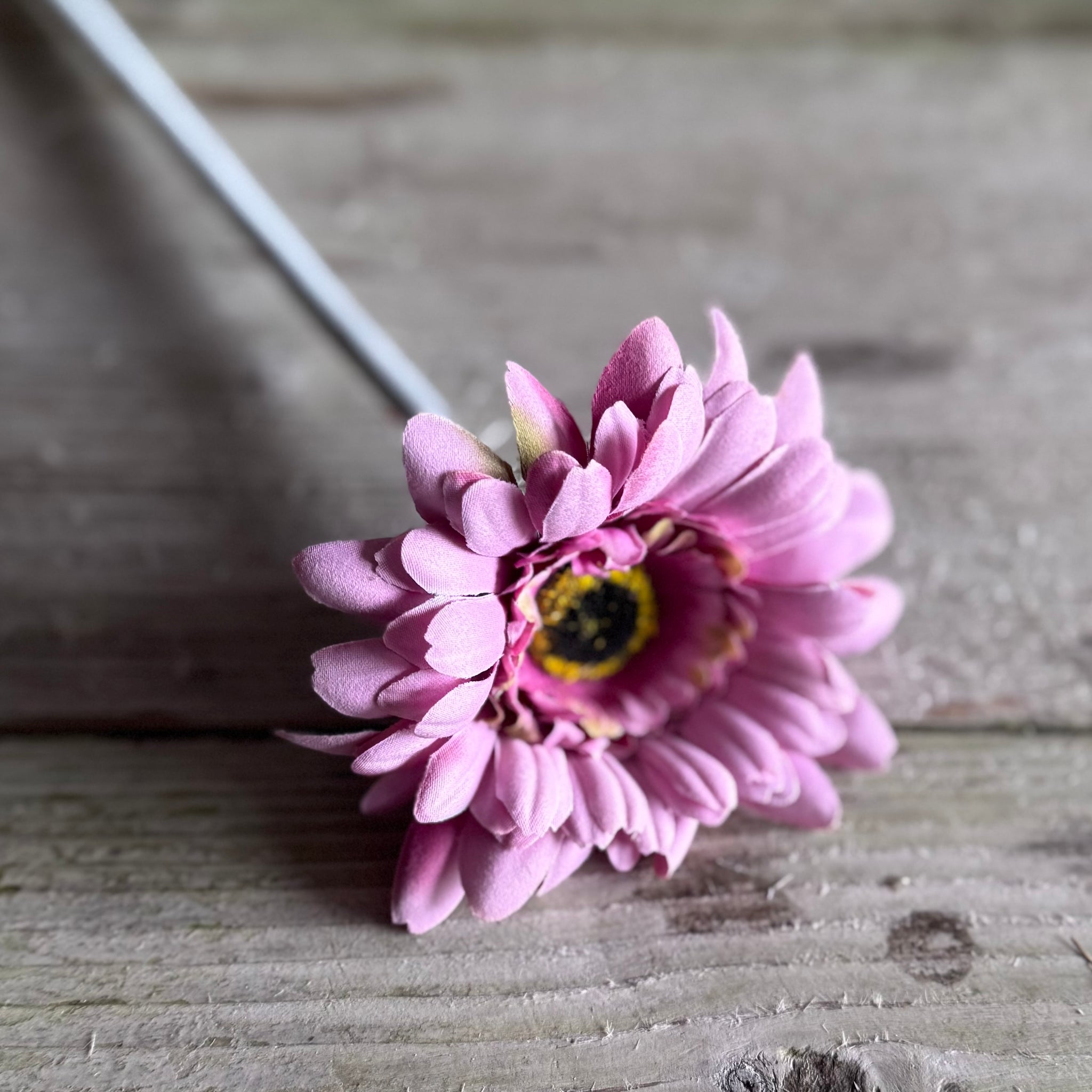 Gerbera Stem in dusky Pink. A delightful artificial flower that captures the essence of the cheerful gerbera in a more compact form. Perfect for adding a touch of brightness to any setting, this smaller version of the beloved gerbera is ideal for a variety of decorative applications.
