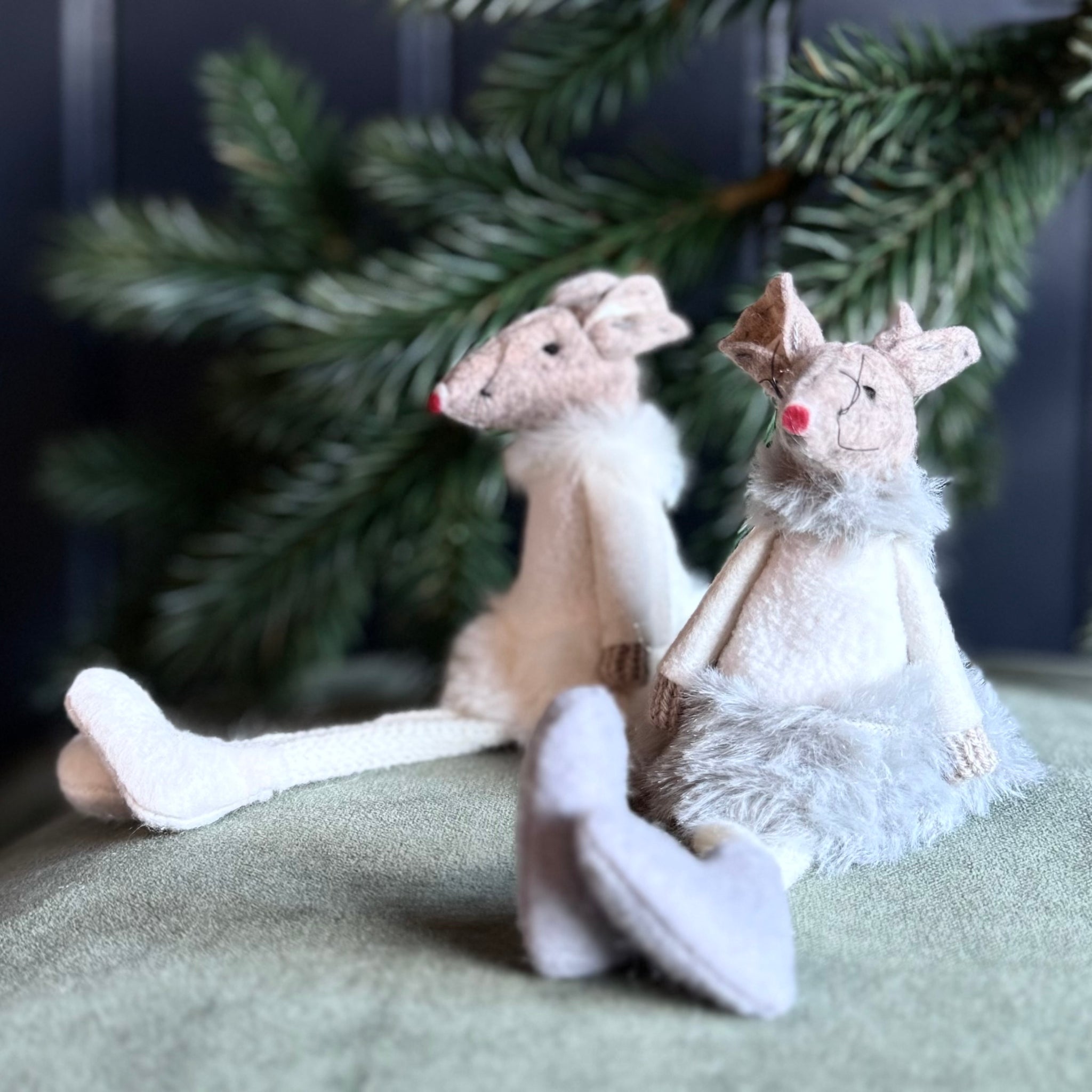 Grey Shelf Sitting Mouse decoration. Dressed in a white fleece tunic trimmed with grey faux fur, felt boots and woolly stockings, this is an adorable decoration. This mouse comes with a loop for hanging or it can be displayed sitting.