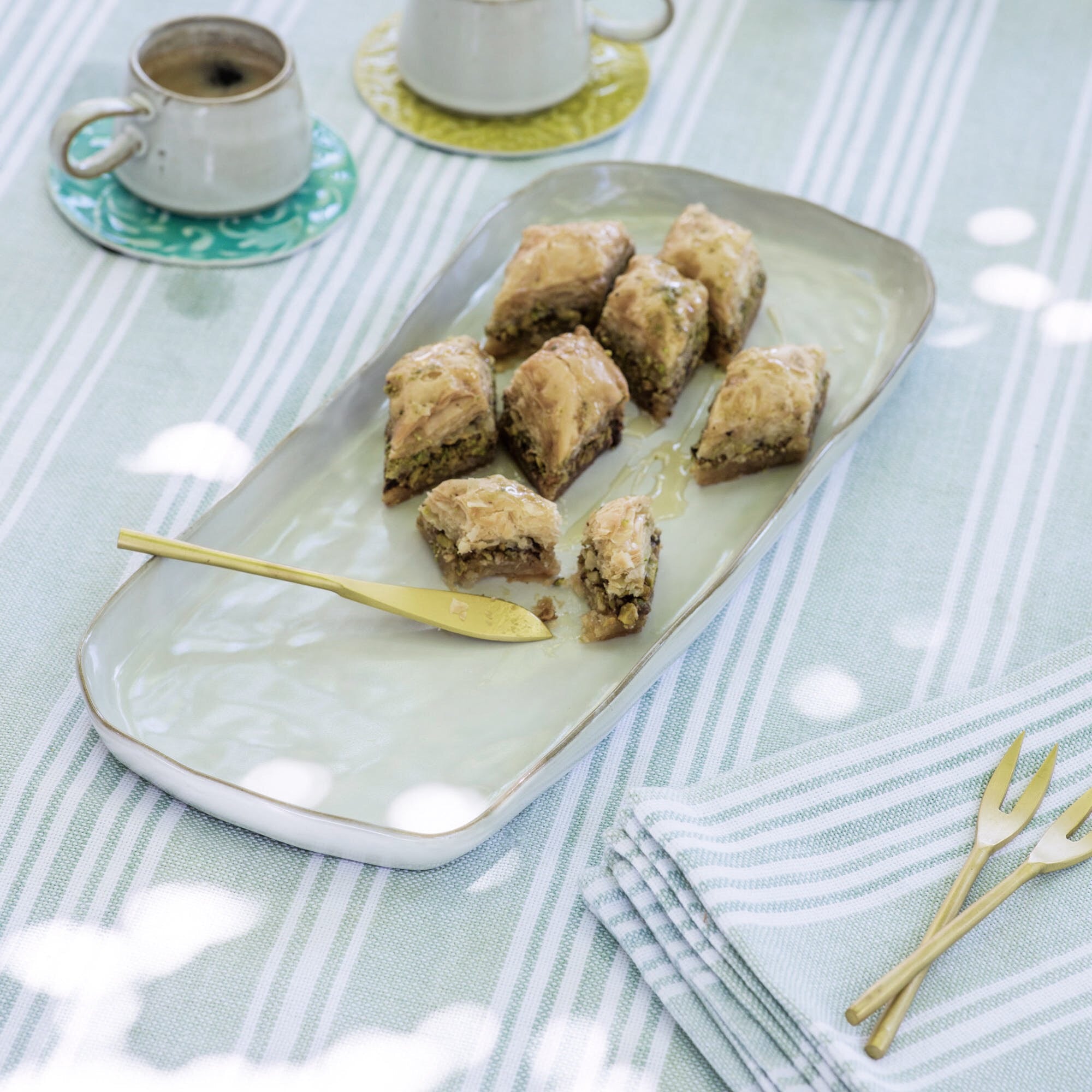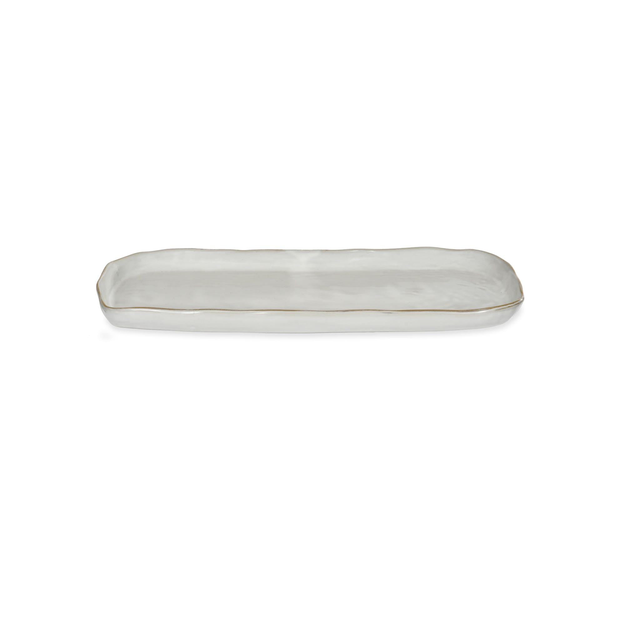Handmade ceramic serving plate. Serve tapas selections, sweet treats and more on this exquisite Serving Tray. Beautifully designed and crafted by skilled artisans, the irregular, rectangle plate is handmade from ceramic, with a soft neutral glaze and natural curved edging.
