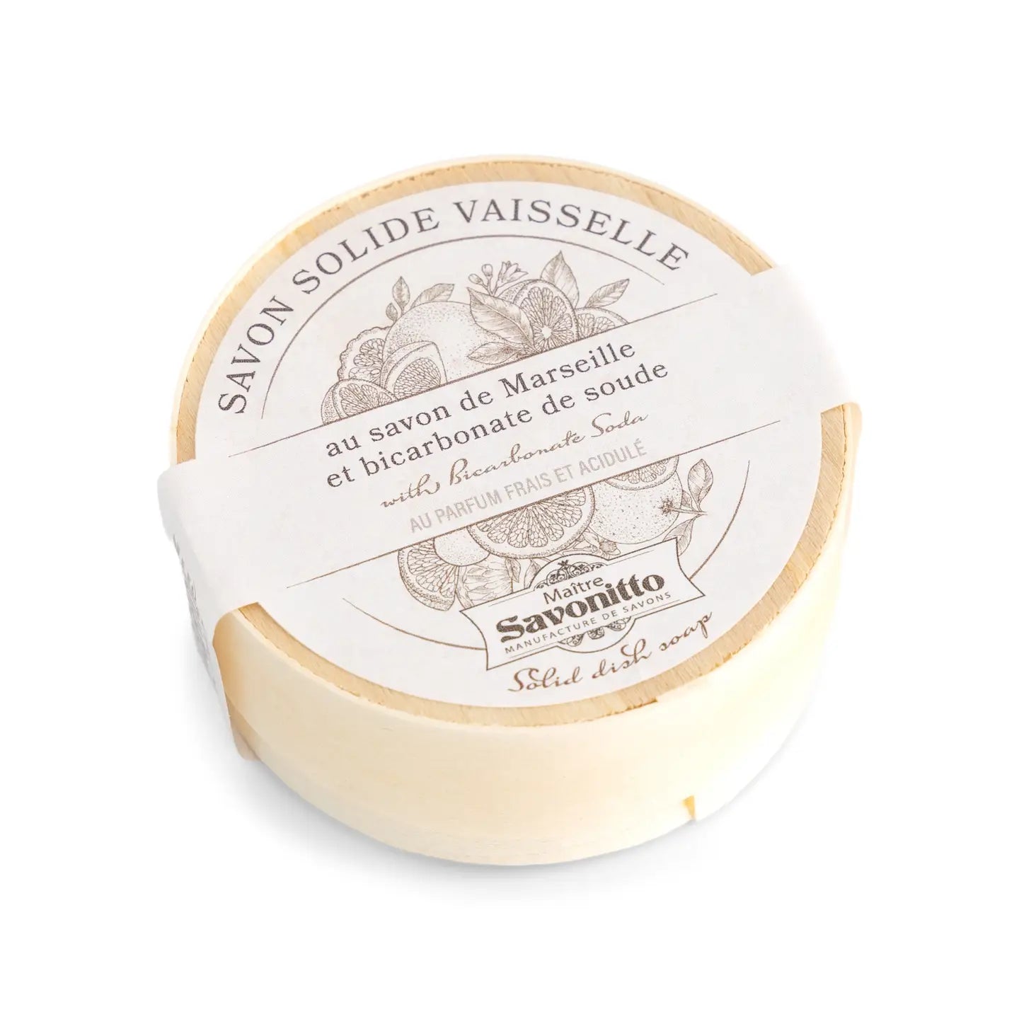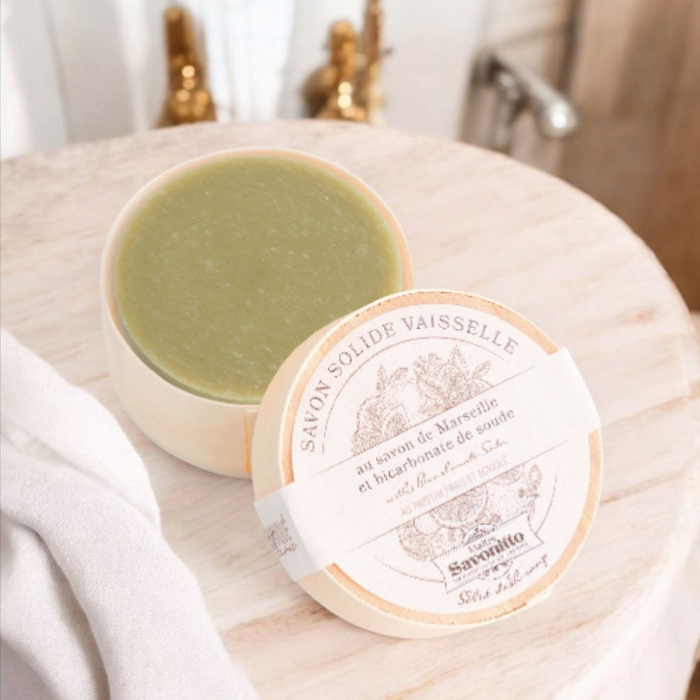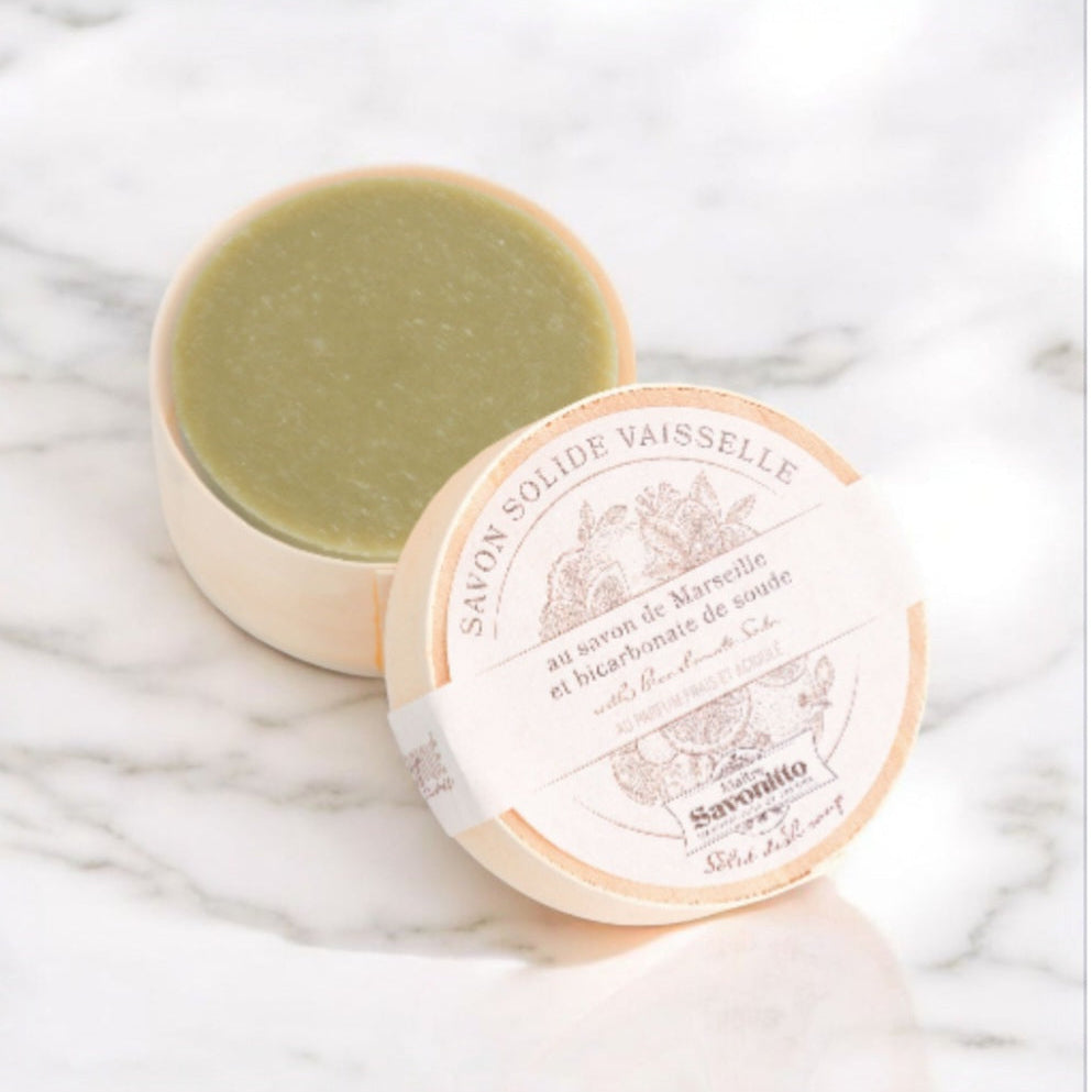 Handmade Solid Dish Soap in a Wooden Box. Clean your dishes naturally and effectively with this eco-friendly solid dish soap. Made with traditional Marseille soap and enriched with baking soda and olive oil, it cuts through grease while leaving a fresh grapefruit scent. 100g