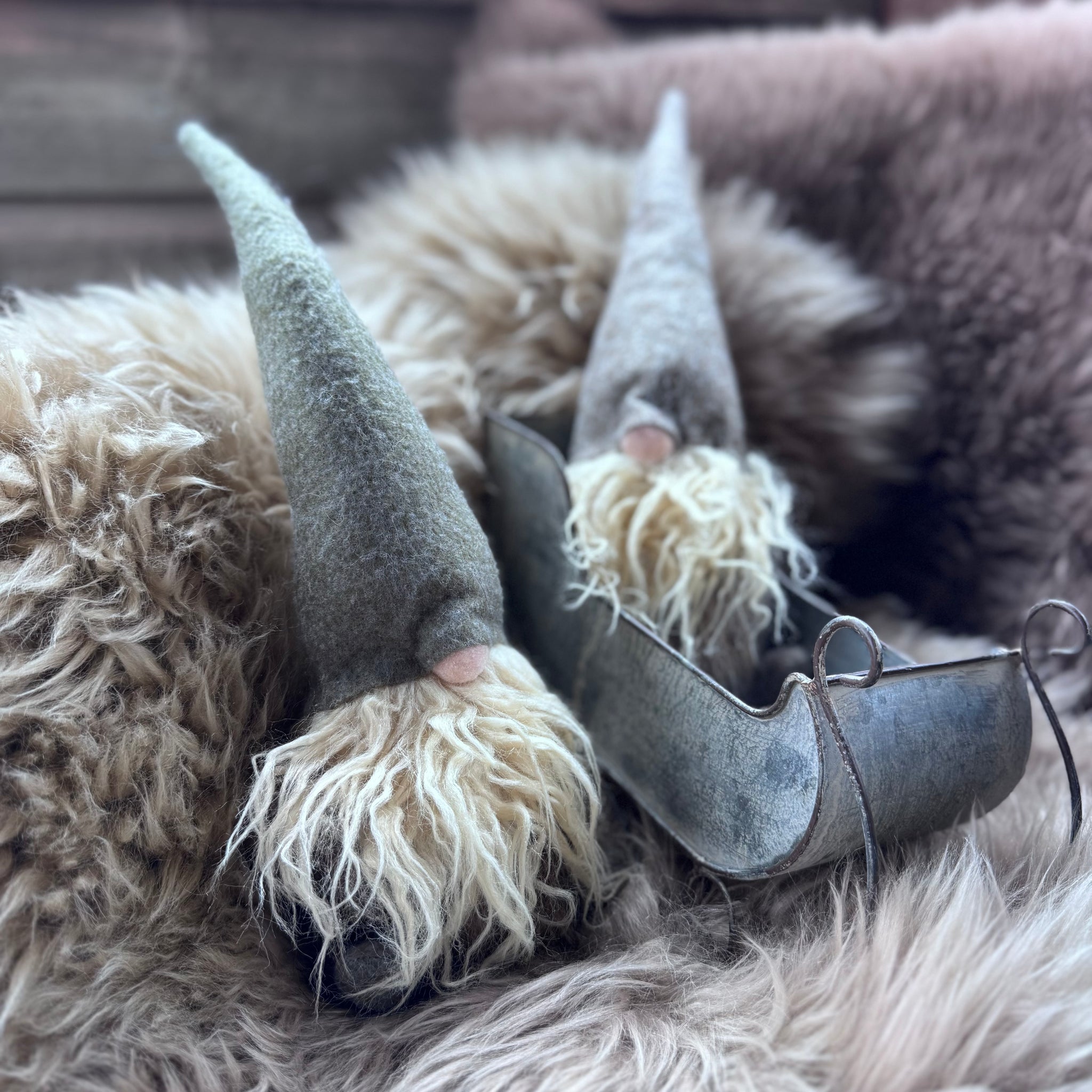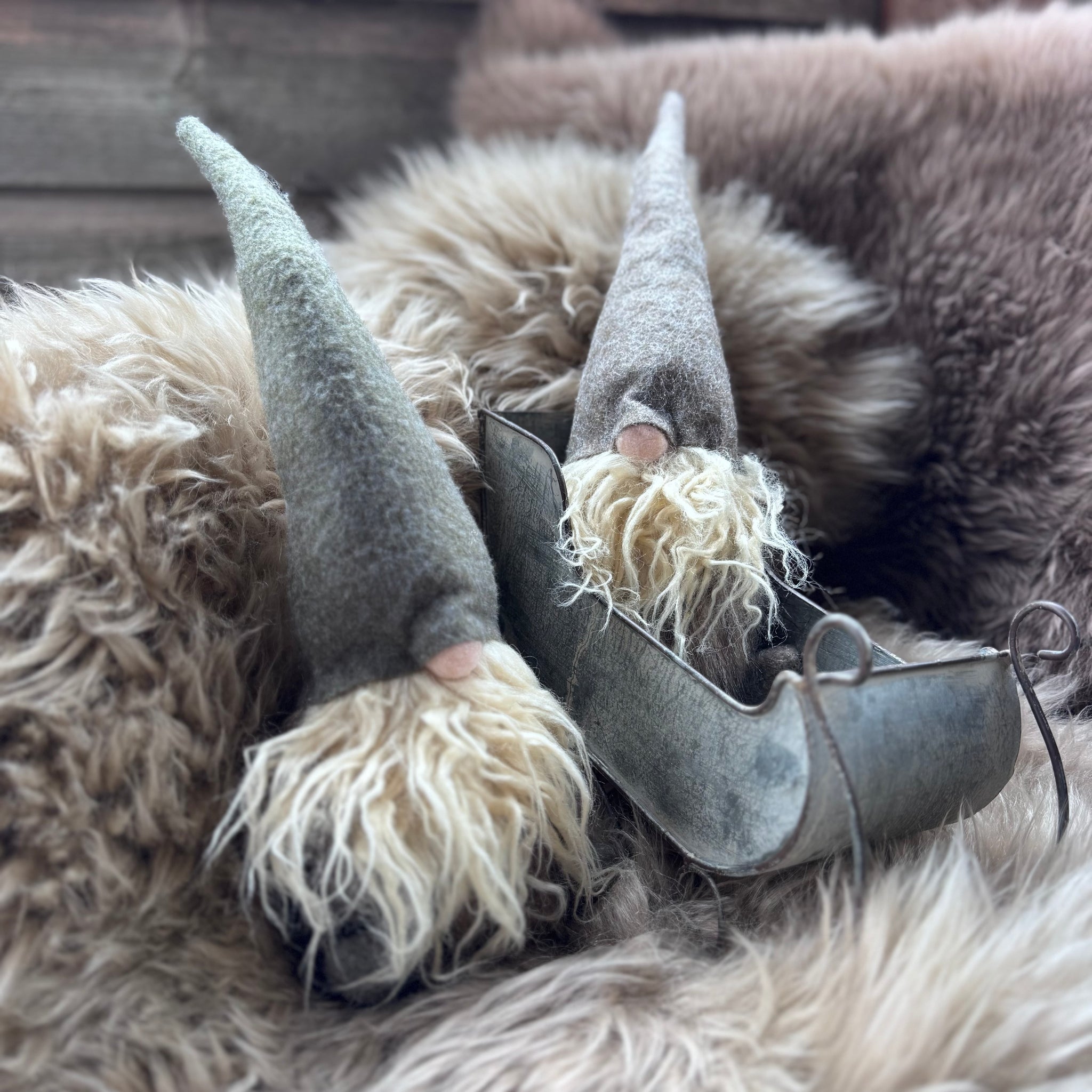 Crafted from felt and faux fur this chap has a long felt hat and a rosy nose. These sitting gonks come in subtle earthy tones and will work wonderfully in a traditional Christmas scheme.