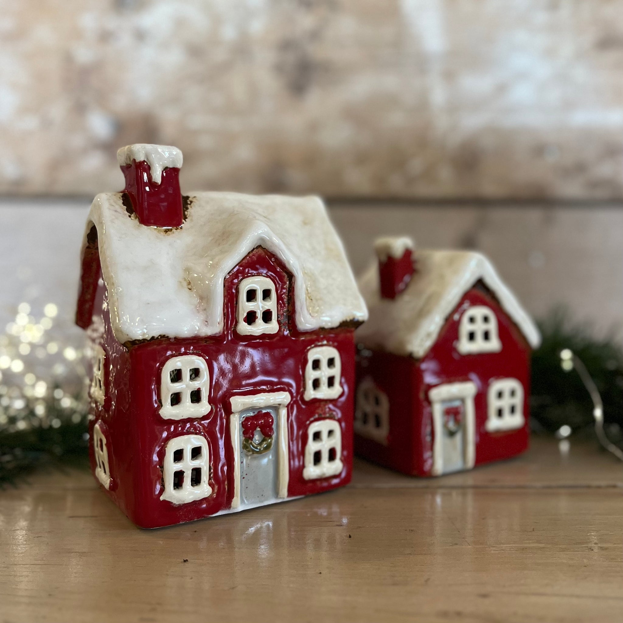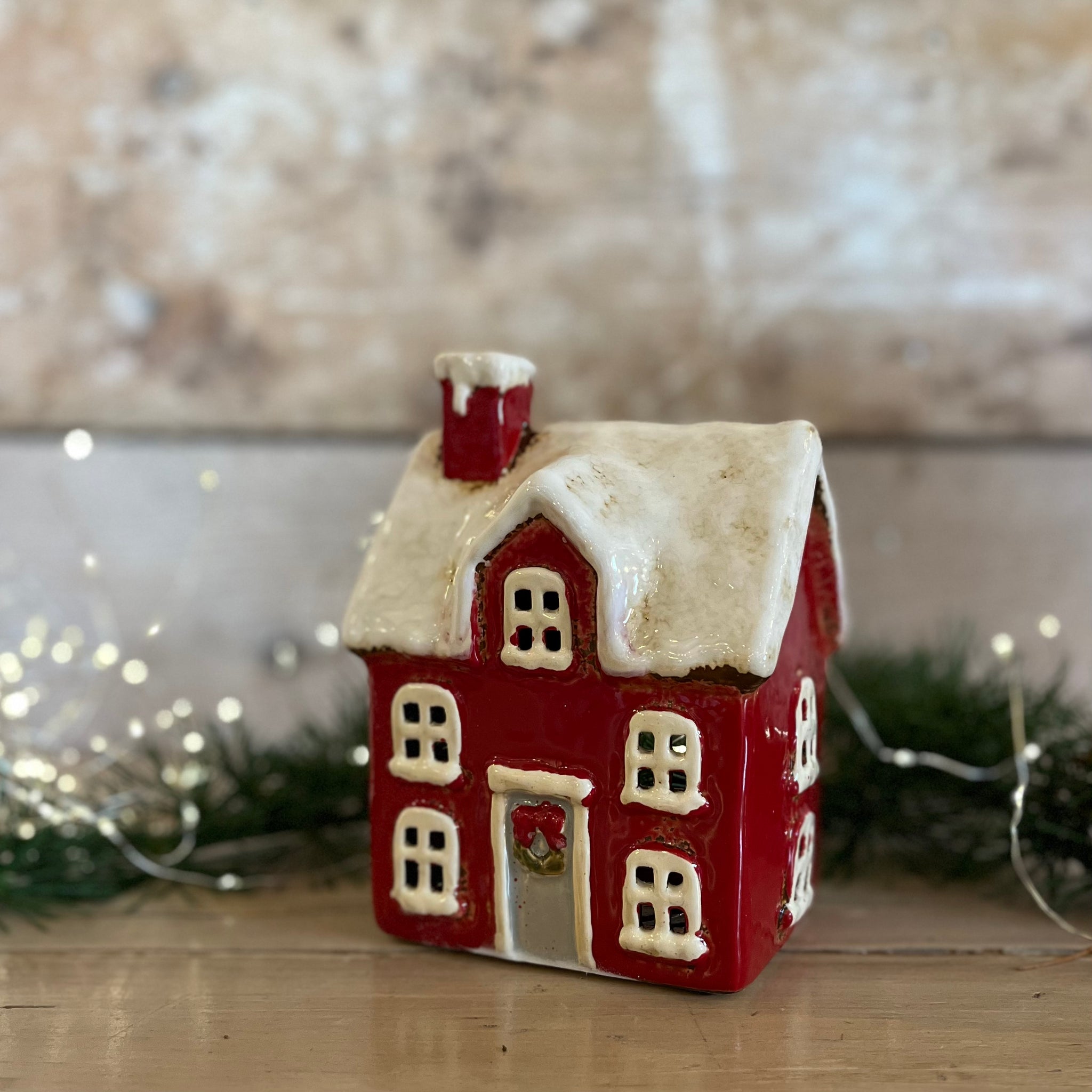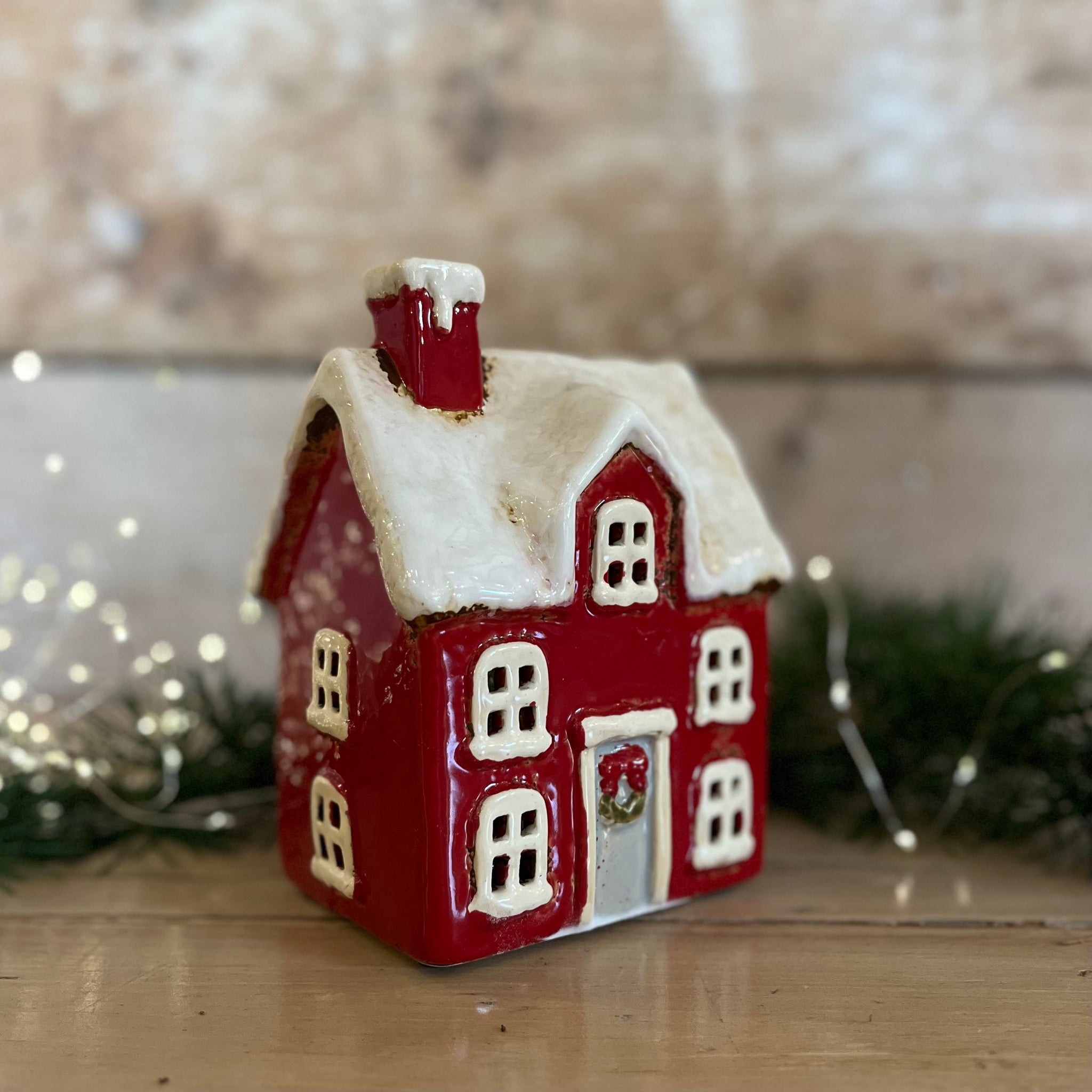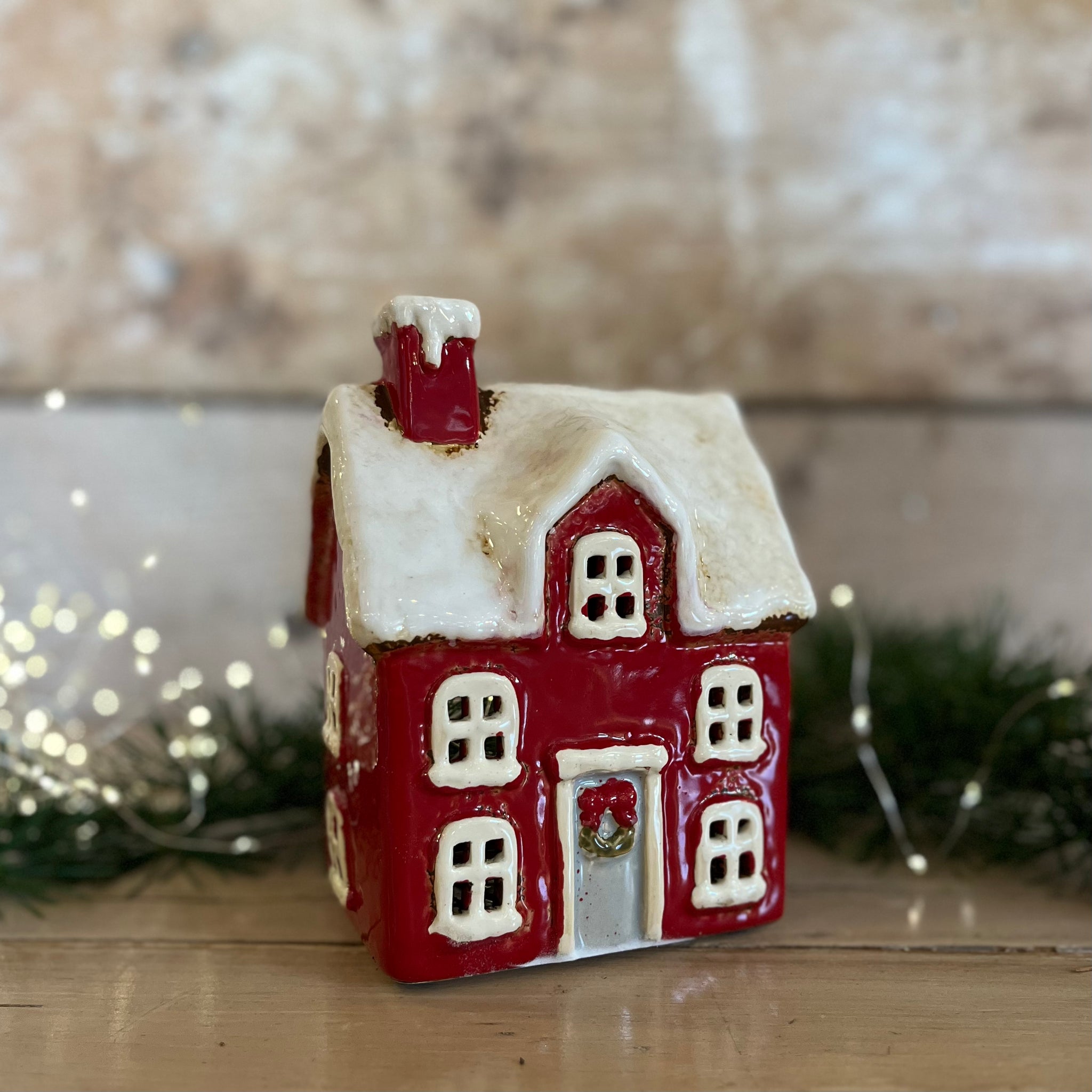 Large Ceramic Christmas House for Tealight. Glazed in red with a Christmas Wreath on the door, this lovely house comes with a gap in the back for a tealight candle (not included) which when lit illuminates the windows, bringing the house to life. Makes a lovely Christmas gift.