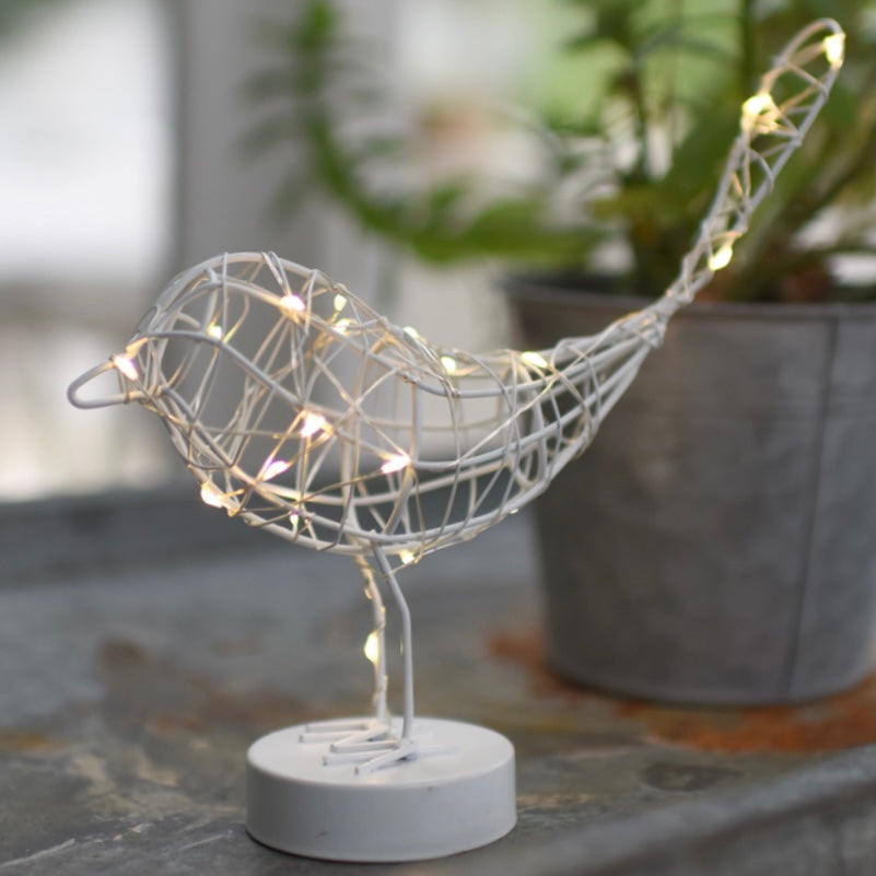 LED Robin Light in white. Freestanding white robin with 20 warm LED lights. Display in windows, on mantels or table tops for a delicate Christmas glow or simply for some winter cheer.