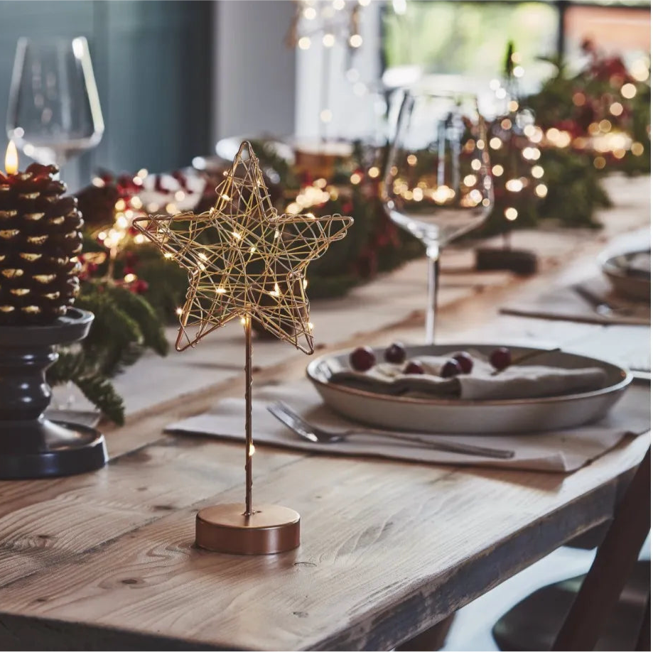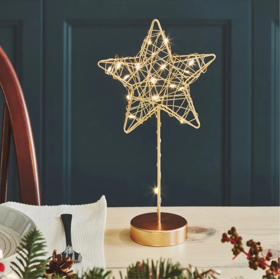 LED Star Light in gold. Freestanding gold star with 20 warm LED lights. Display in windows, on mantels or table tops for a delicate Christmas glow or simply for some winter cheer.