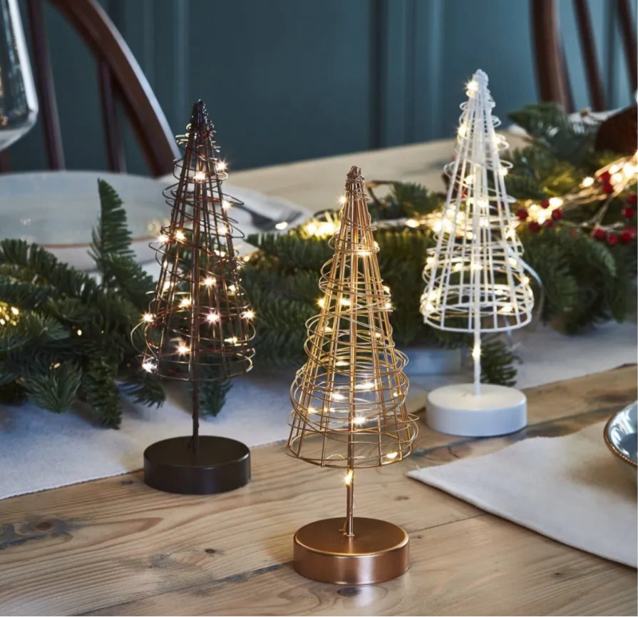 LED Tree Light in gold. Freestanding gold tree with 20 warm LED lights. Display in windows, on mantels or table tops for a delicate Christmas glow or simply for some winter cheer.
