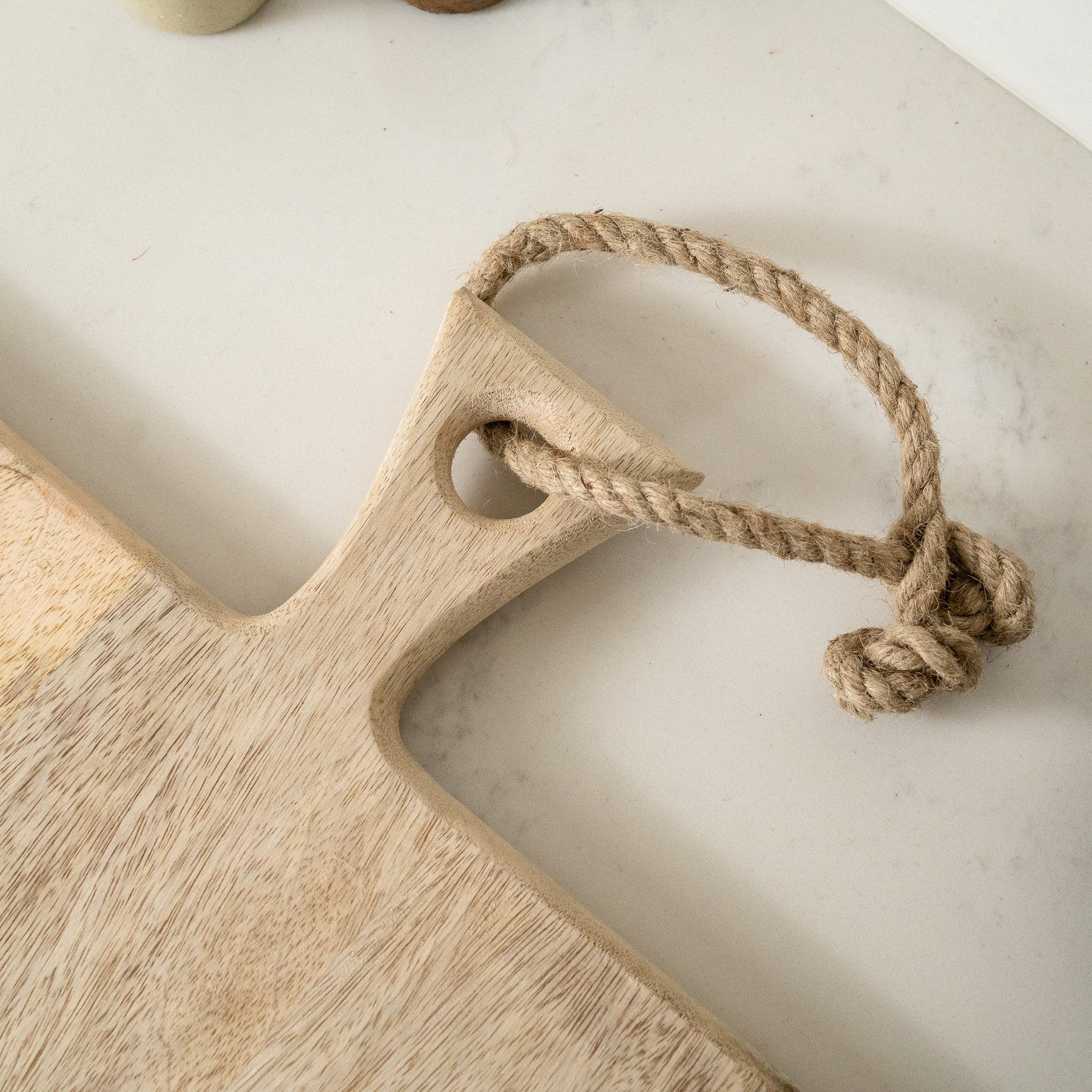 Mango Wood Paddle Board. These beautifully crafted square paddle boards with rustic rope handle, are perfect to use as a bread board, chopping board or serving plate. Their shape makes them spacious enough to chop on with enough room to serve antipasti or other nibbles. Compete with a large handle to make it easy to manoeuvre and finished with a rustic rope tie to neatly hang up and store away.
