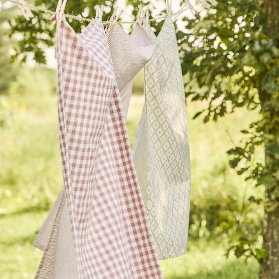 Dusty Mauve Gingham Cotton Teatowel. 100% cotton teatowel in mauve and natural gingham design. Comes with a handy hanging loop so you can show off these lovely textiles while keeping them close to hand.