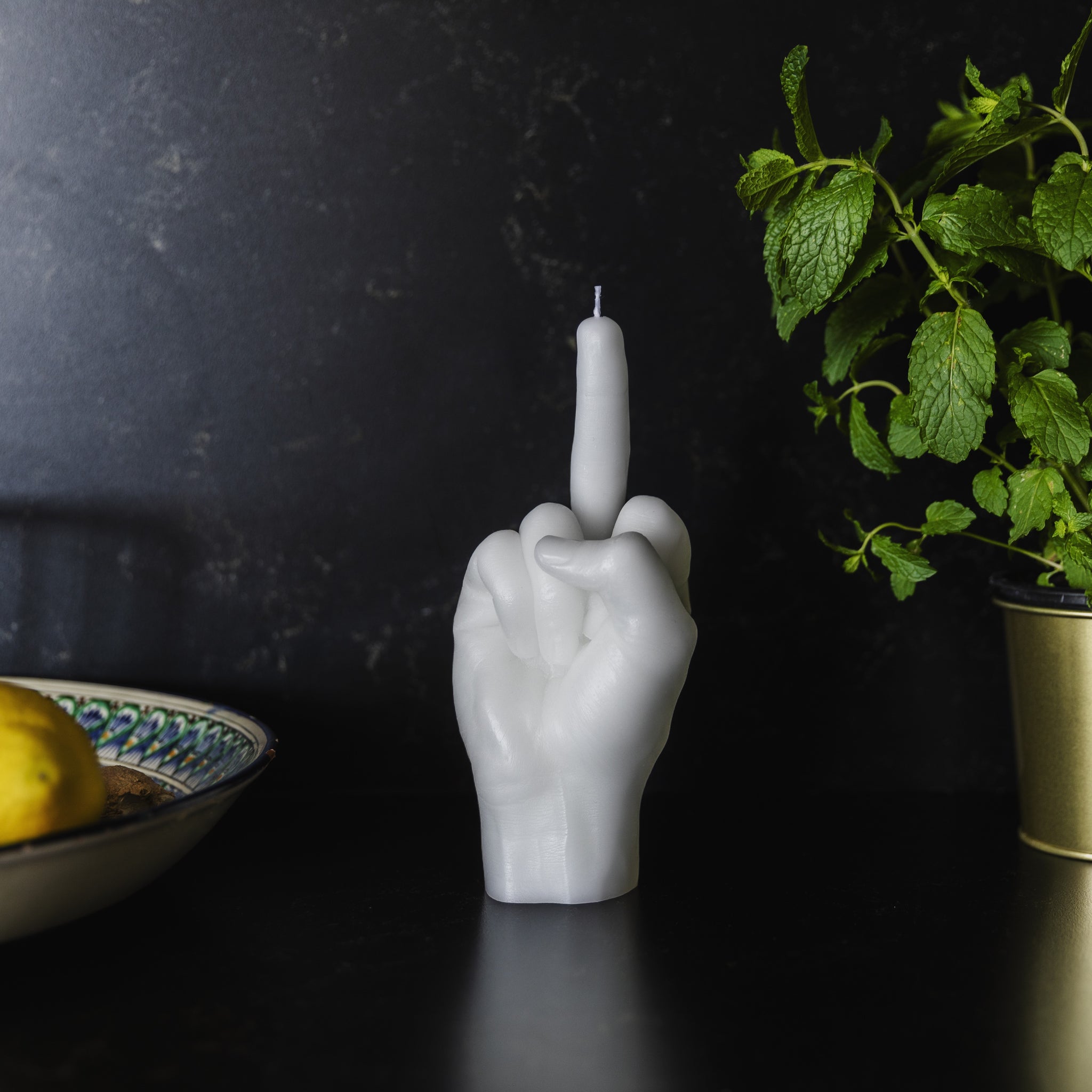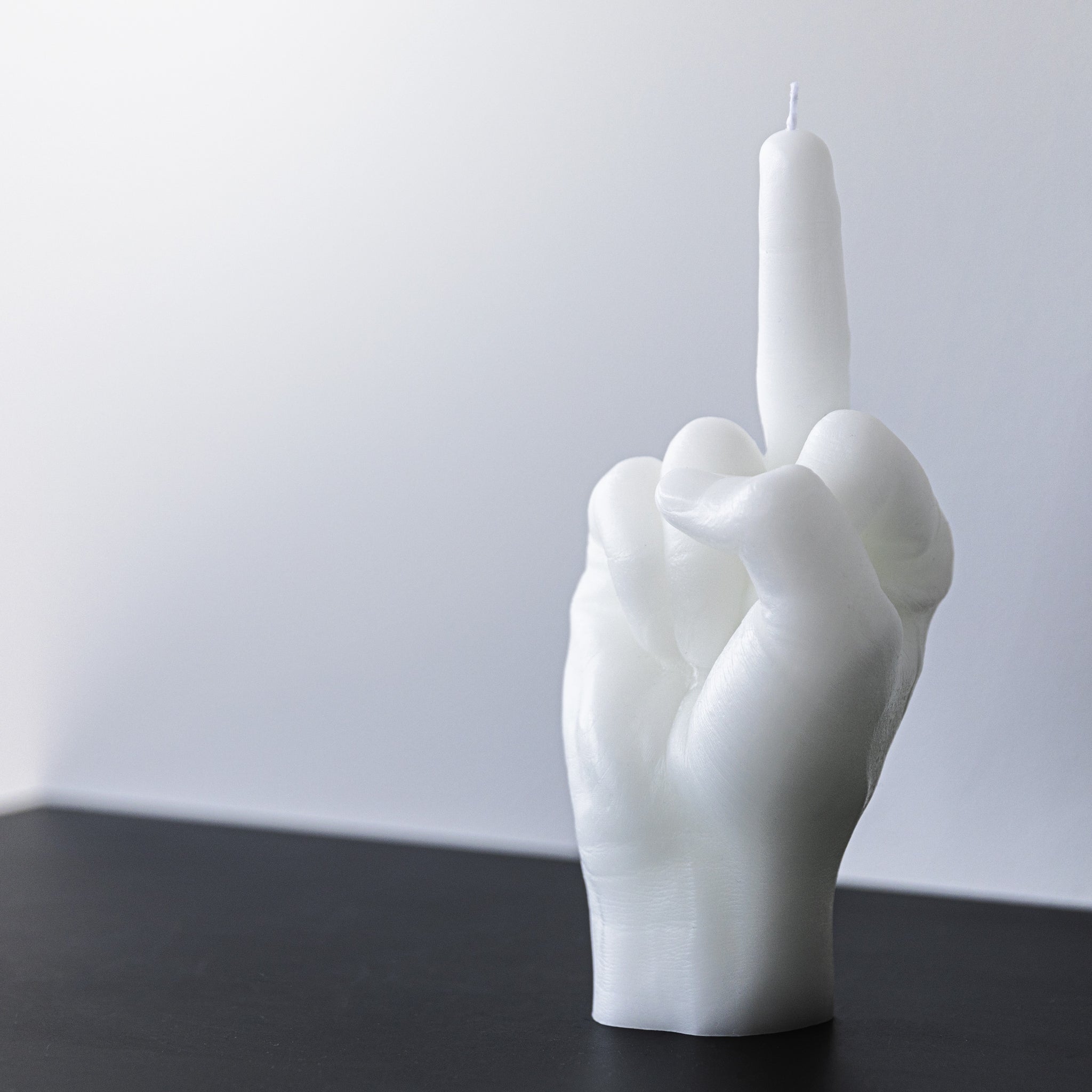 Middle Finger Candle in White. This handcrafted middle finger candle is a piece of art and a conversation starter. Realistic and super detailed, this candle comes packed in a beautiful ready-to-gift box. Looks great on the shop shelf or in the window.