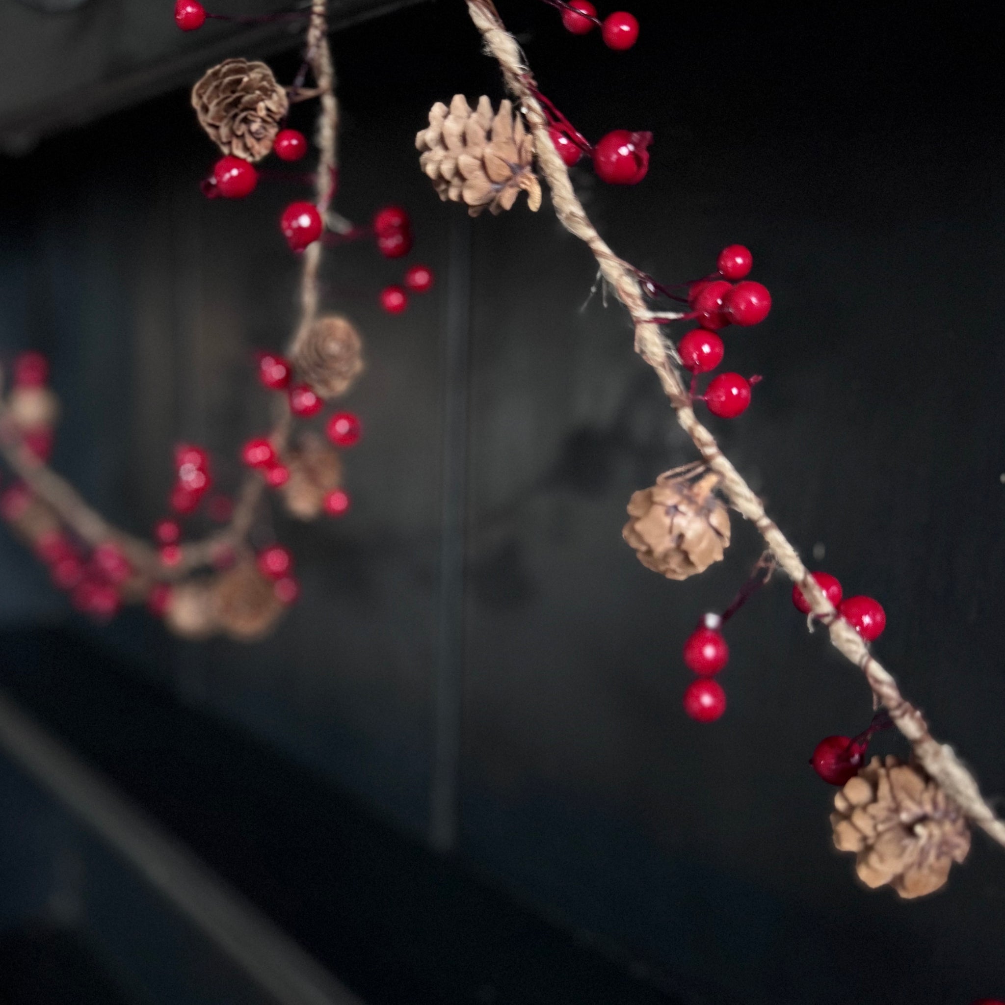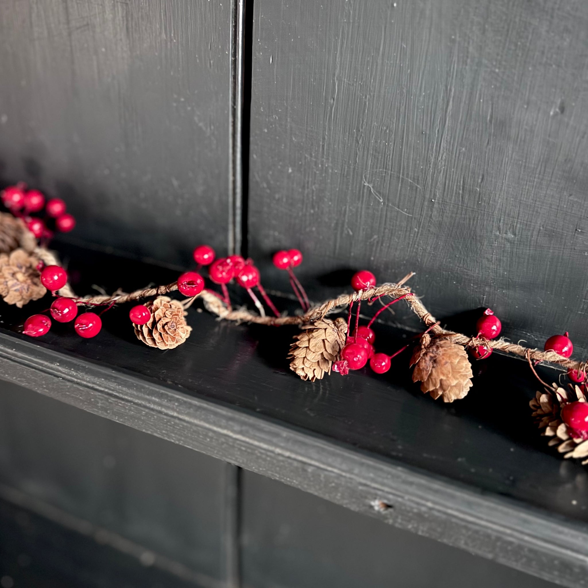 Pine Cone and Red Berry Garland. A lovely rustic garland which can be used throughout Autumn and Winter to adorn your home. Crafted from real pine cones and faux red berries on twine.