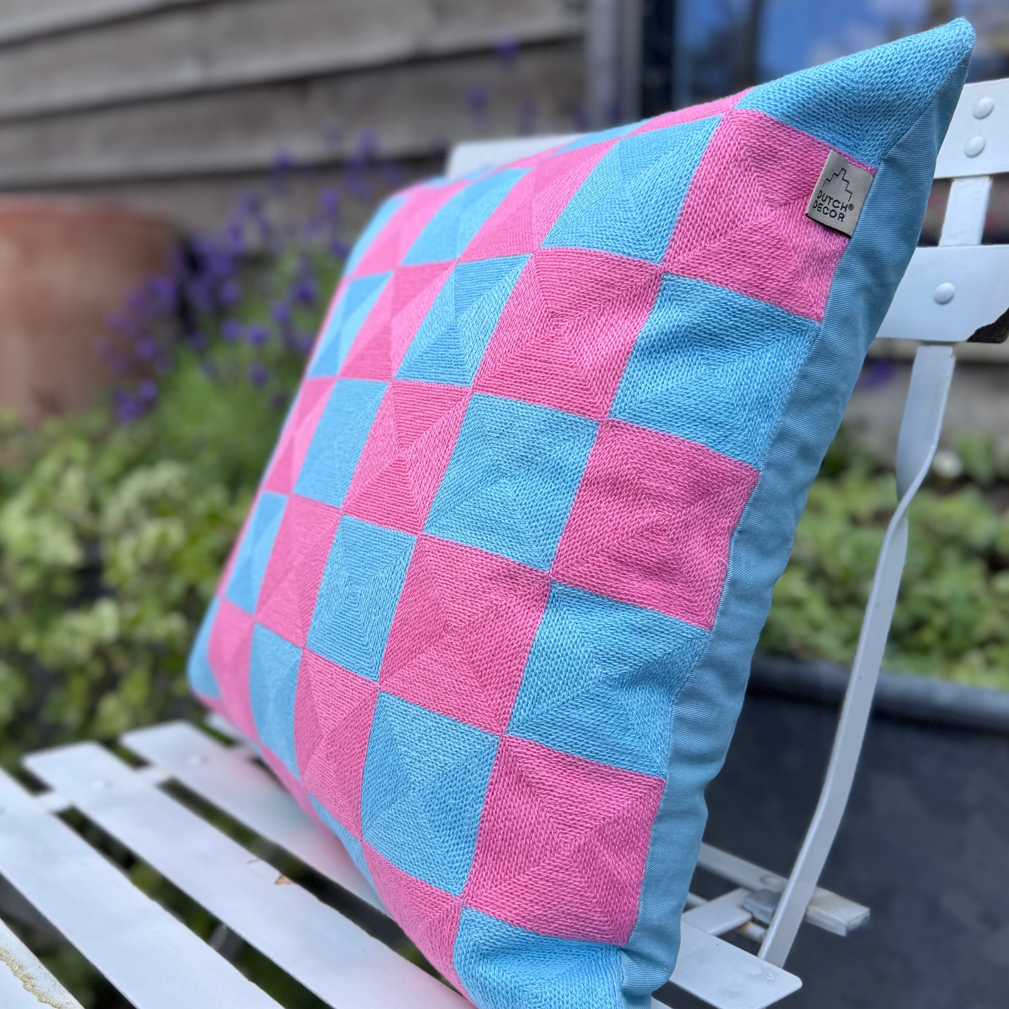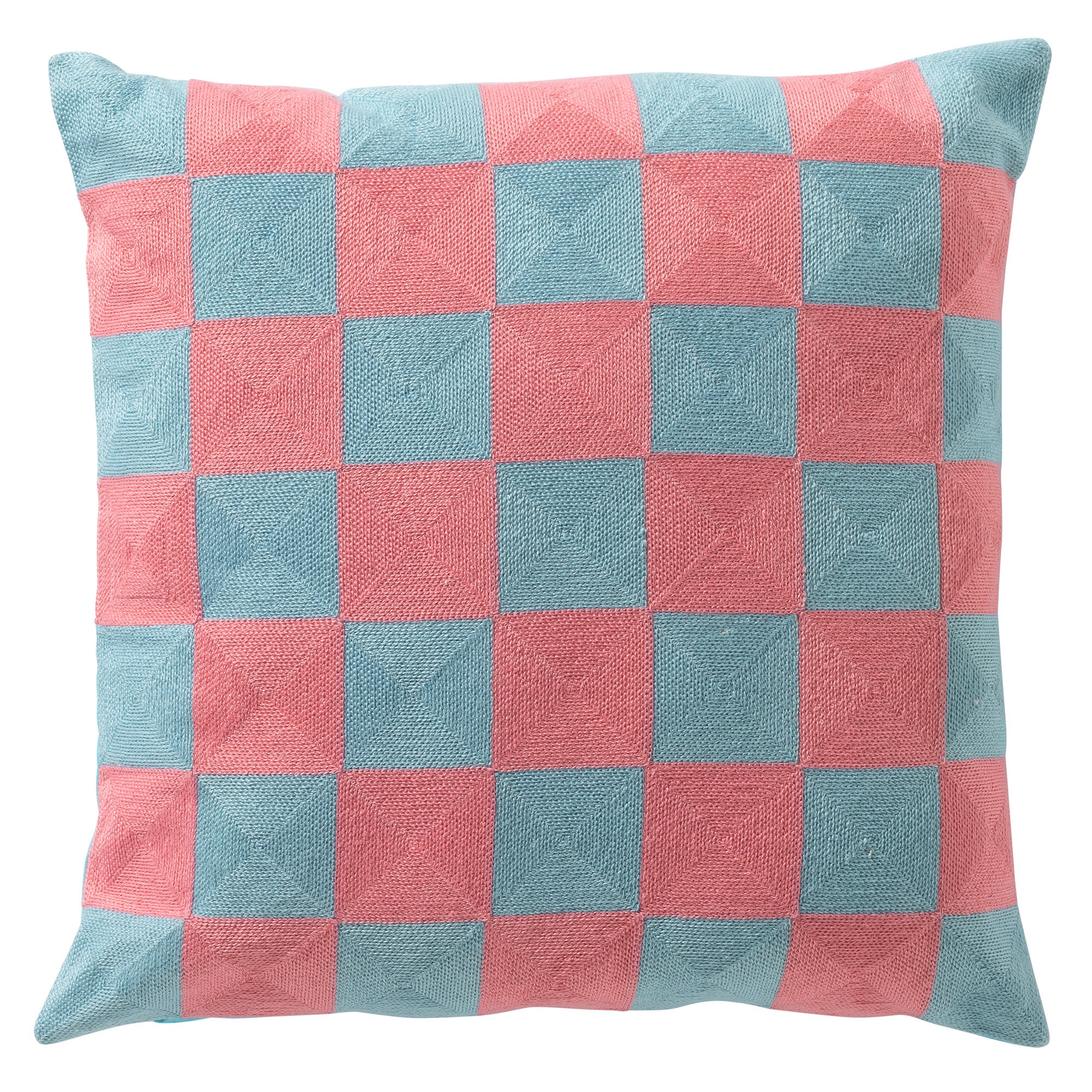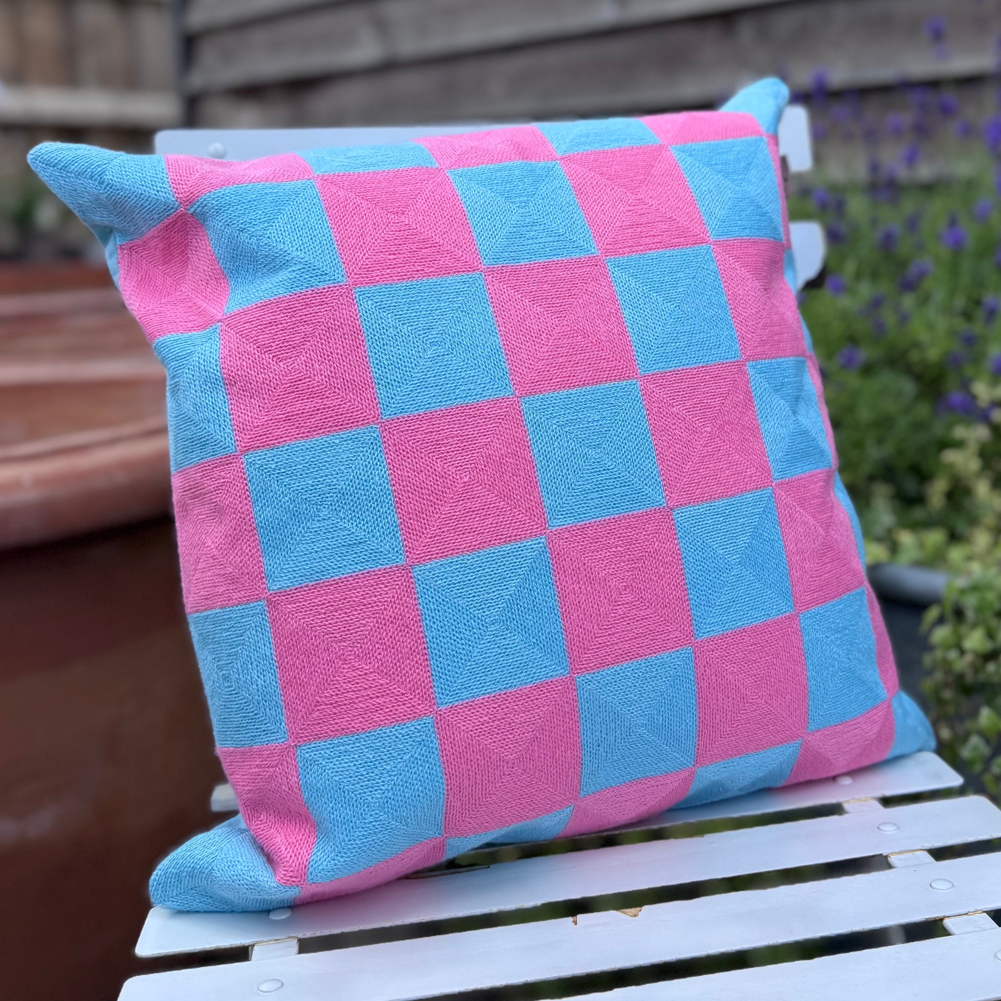 Pink and Blue Check Square Cushion 45cm. A bright and fun checked cushion in shades of aqua blue and bright pink. This cushion has woven squares on one side and a plain blue back. Zip closure for ease of care. Comes complete with a hollow fibre inner.