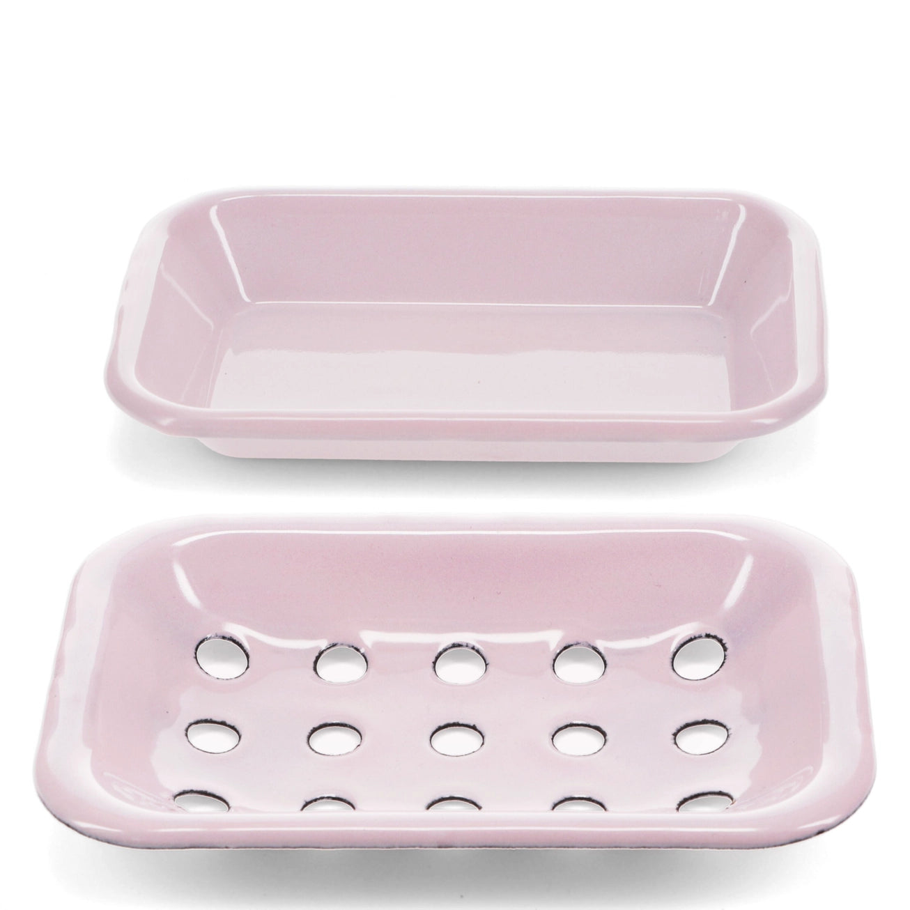Pink enamel 2-part soap dish with. This soap dish comes with a solid, enamel outer dish and a removable inner draining dish, prolonging the life of your soap. Enamel is a great material for the side of the sink being unbreakable. It's a seamless blend of form and function. Its vintage-inspired look, with distressed edging in black, gives it rustic charm. A unique housewarming gift.