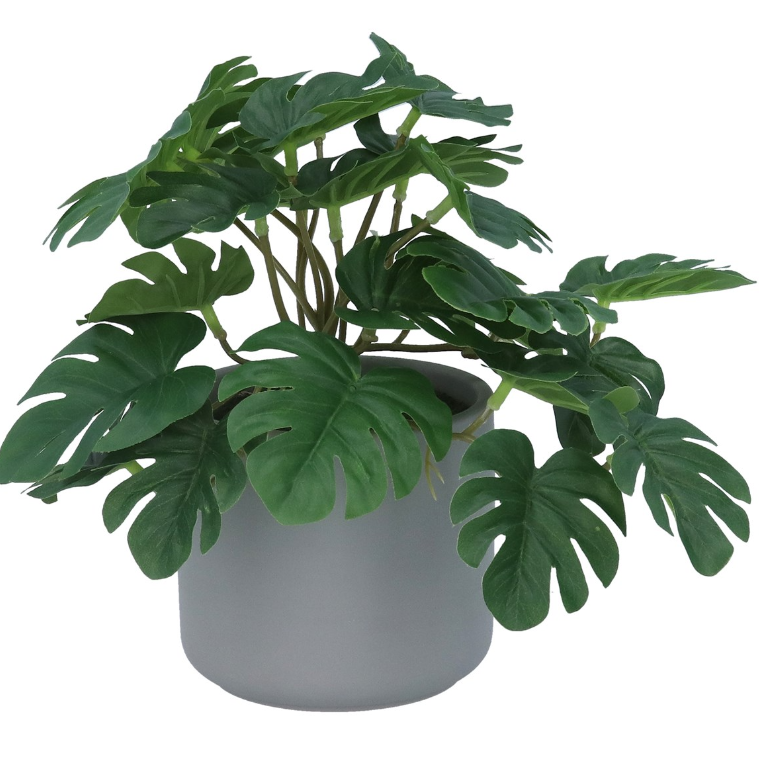 Faux mini swiss cheese plant in a grey pot. This realistic looking, small artificial plant looks great on a shelf, table, cupboard or mantle. Perfect for the less green-fingered of us.