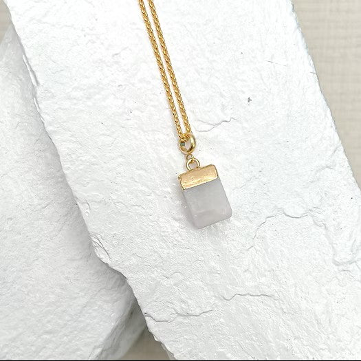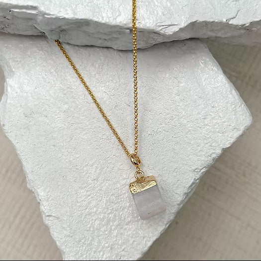 Quartz Cube Gold Plated Necklace. Minimal yet powerful, this Quartz Cube Necklace features a geometric cube pendant (approx. 18–21mm) on an 18k gold-plated chain. Quartz is a versatile stone that amplifies energy and clarity, perfect for everyday wear or gifting. Crafted from ethically-sourced semi-precious gemstones, these pieces make ideal gifts for a loved one or a well-deserved treat for yourself.