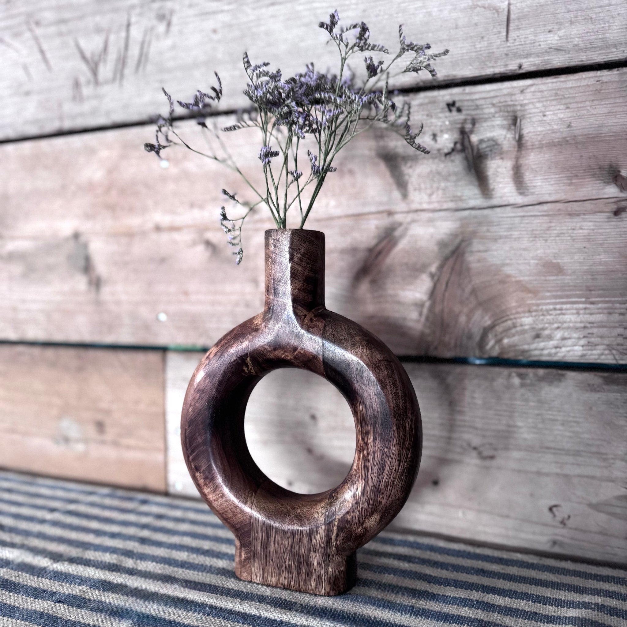 Round Wooden Vase. Crafted from Mango wood, this wooden vase can be used as a standalone decorative object or you can add some dried or faux stems for added interest.