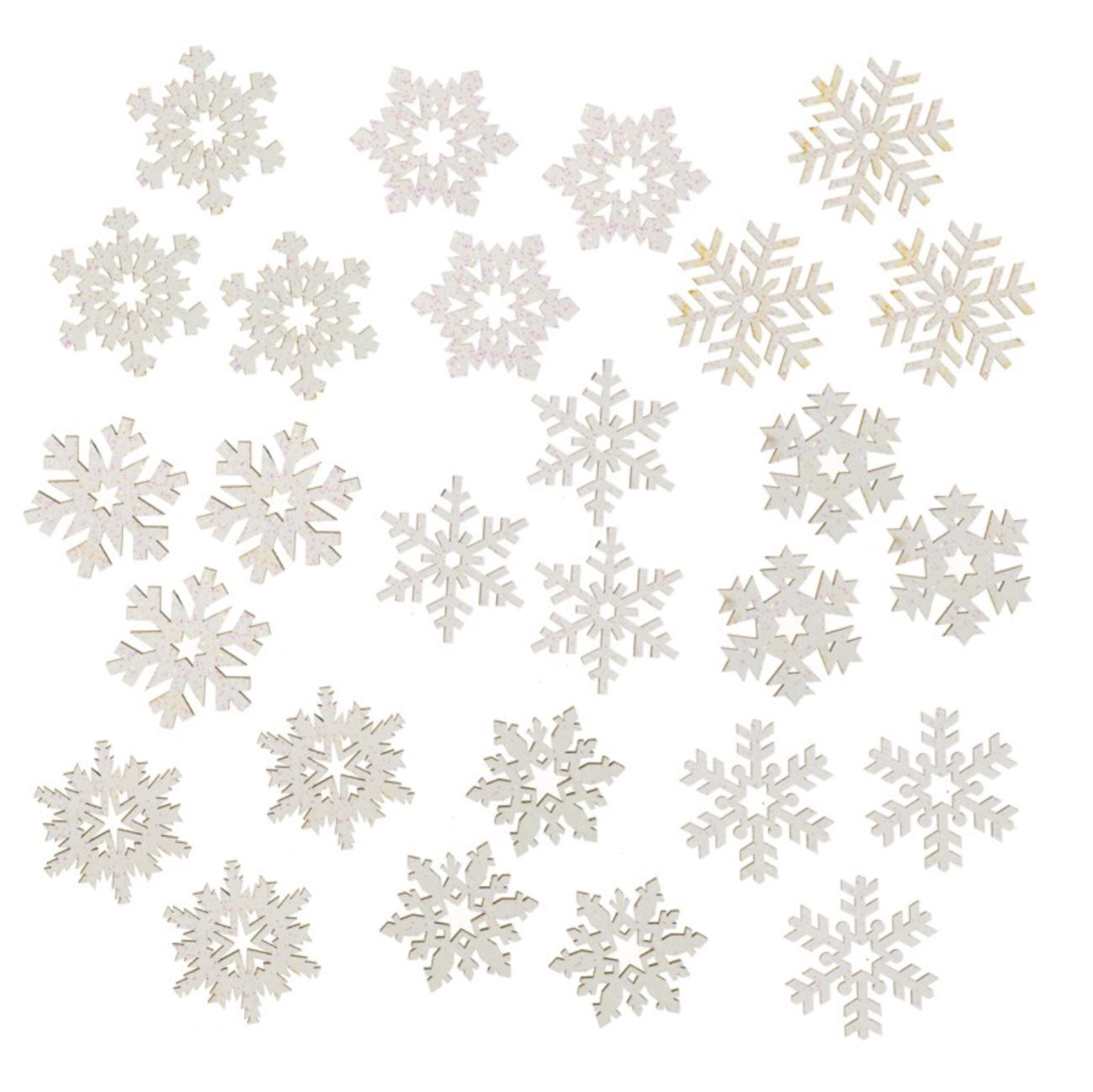 Set of 27 Scatter Snowflakes. Assorted white snowflakes with a hint of glitter. Scatter across your Christmas table or along a festive shelf display. Or you can use these tied with ribbon to embellish your gift wrapping.