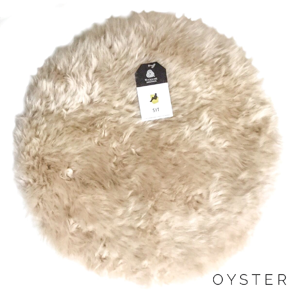 Circular sheepskin Seat pad. Ideal for adding texture and comfort to a chair or stool. Available in a variety of dyed colours. Oyster is a warm, pale oatmeal colour, softer in tone than traditional ivory sheepskins