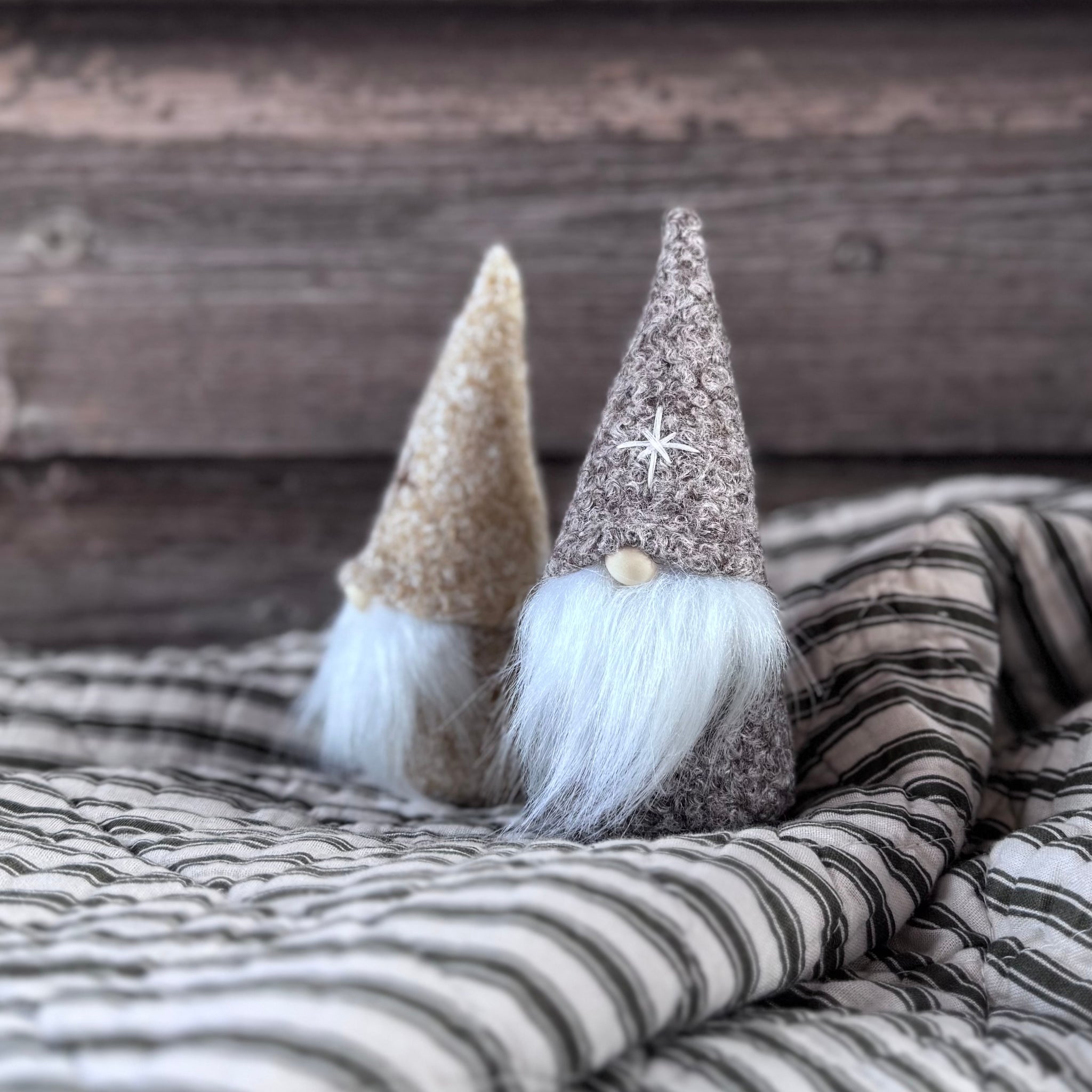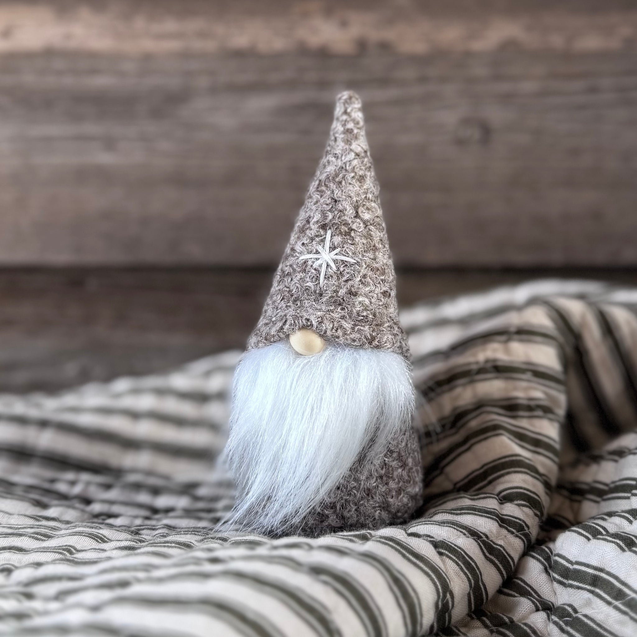 Small Wool Gonks. Sold individually and available in a choice of two colours, these cute little chaps make a lovely addition to a traditional Christmas scheme. Clad in earthy toned fabric with stiched stars on their hats. Place on a shelf or Christmas tray display and watch how he makes everyone smile. Sold individually.