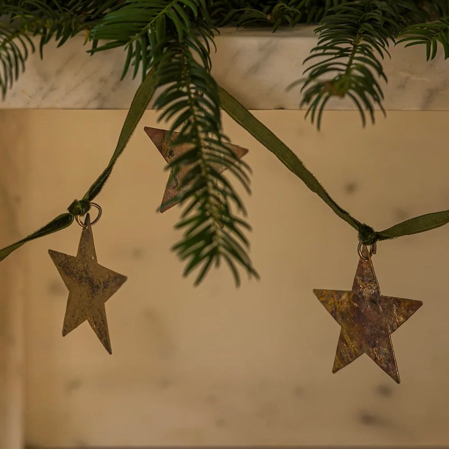 Star Garland on Velvet Ribbon. This festive garland features antique brass-finished stars strung along a green velvet ribbon. The softly aged metal adds warmth and texture to seasonal displays, with a subtle shine that pairs beautifully with foliage or candlelight.