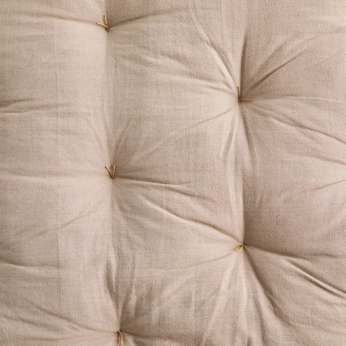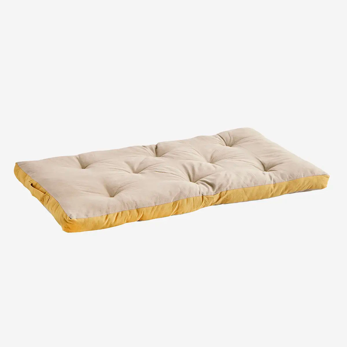 Taupe and Mustard Cotton Mattress. Plain cotton mattress pad suitable for a bench or chair, or can be used as a floor cushion. In a taupe colour featuring a constrasting mustard box edge, this padded cushion is rectangular in shape so can be used flat or draped across the back and base of a chair. With handles on each end, you can easily carry it outside when the weather is good.
