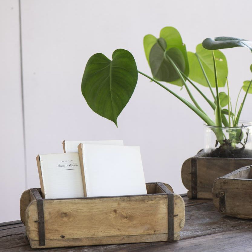 Wooden moulds were traditionally used in India to make handmoulded bricks. The clay was put in the mould, where it was pressed and shaken, then the brick taken out, so it cours lie in the sun and dry – and the mould would then be ready to make the next brick. These days, they make an attractive storage box or caddy.