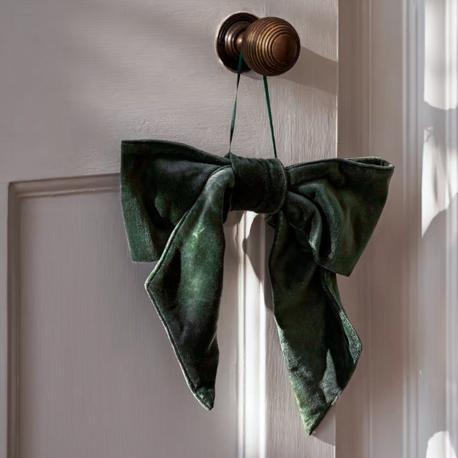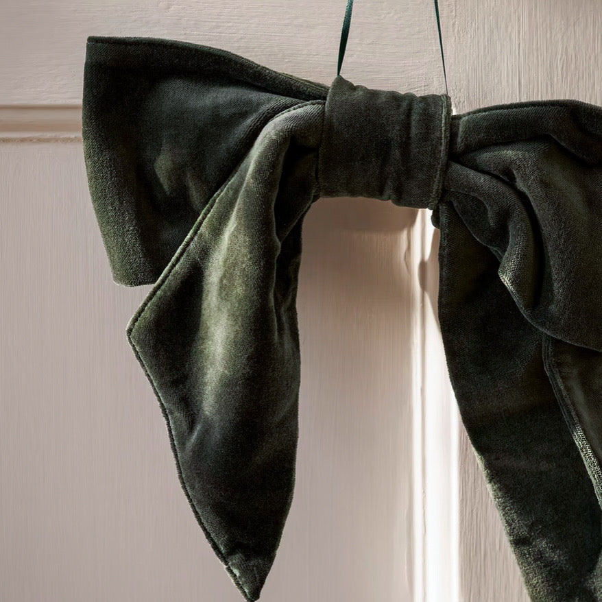 Velvet Door Bow Decoration in Green. This beautifully hand-tied velvet Christmas Bow decoration adds a festive flourish to a door, whether it’s gracing a wreath or hanging on its own on its colour-matched cotton hanging loop. Created from luxurious cotton velvet, this classy decoration is a beautiful fern green colour and is also available in berry red. Hang on a door, picture frame, mirror, chair back or wreath.