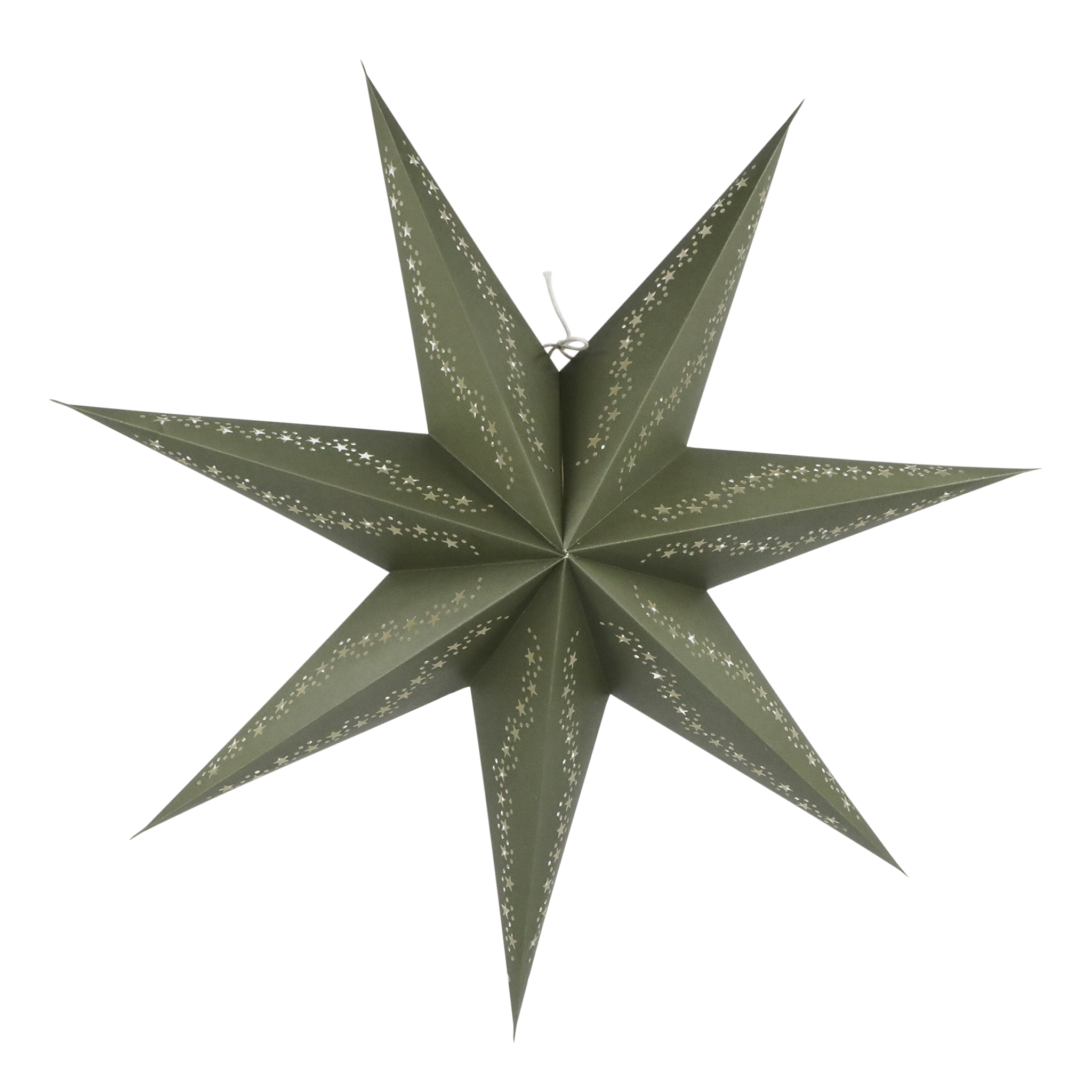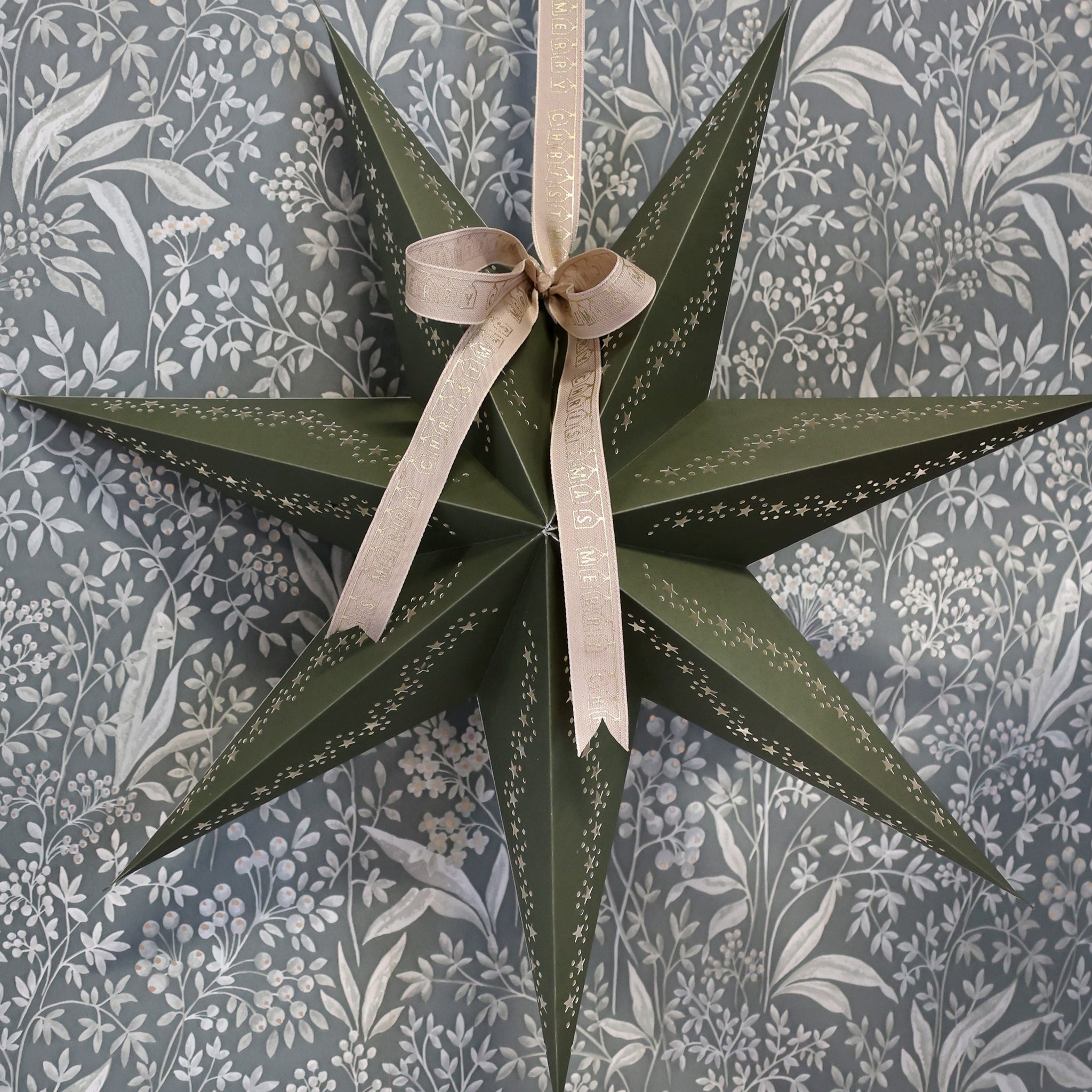 Vintage paper star decoration in olive green. 3D, fold out star decoration, crafted from paper with star cutouts. Display alone or as a cluster to create a festive constellation.