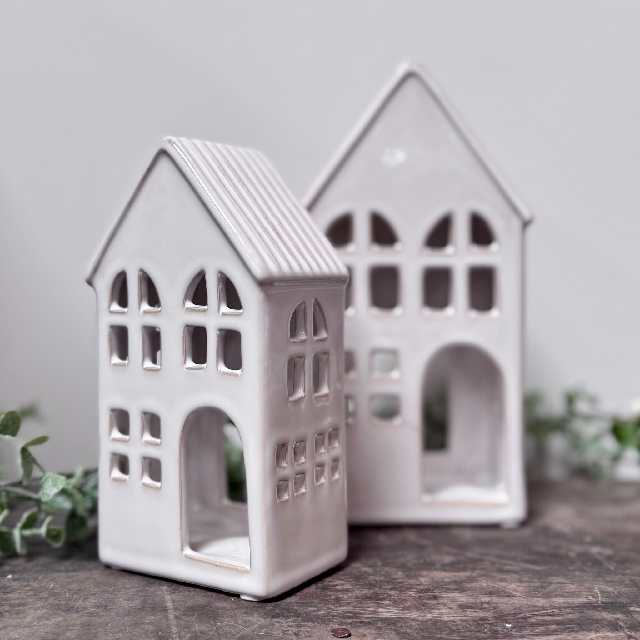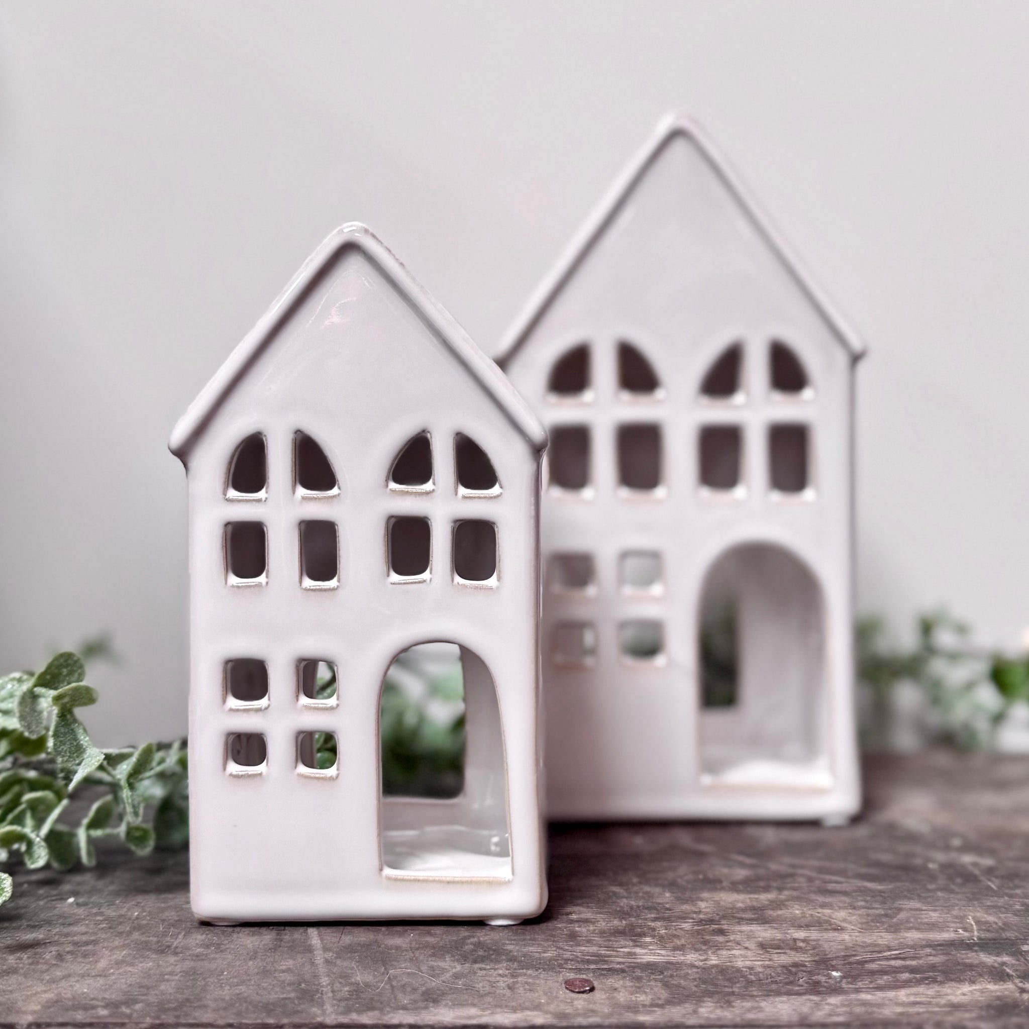 White Ceramic Tealight Houses. Available in two sizes and sold individually, these pristine ceramic houses create a magical winter wonderland ambience with golden glow through windows. Architectural details offer sophisticated simplicity for modern and traditional spaces. For use with a tealight candle or small LED lights (not included).