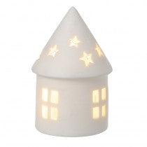 White round house with LED light and star detail. Illuminate windows, mantles, shelves or tables bringing the house to life. Makes a lovely housewarming gift. Comes with batteries - remove battery guard to operate.