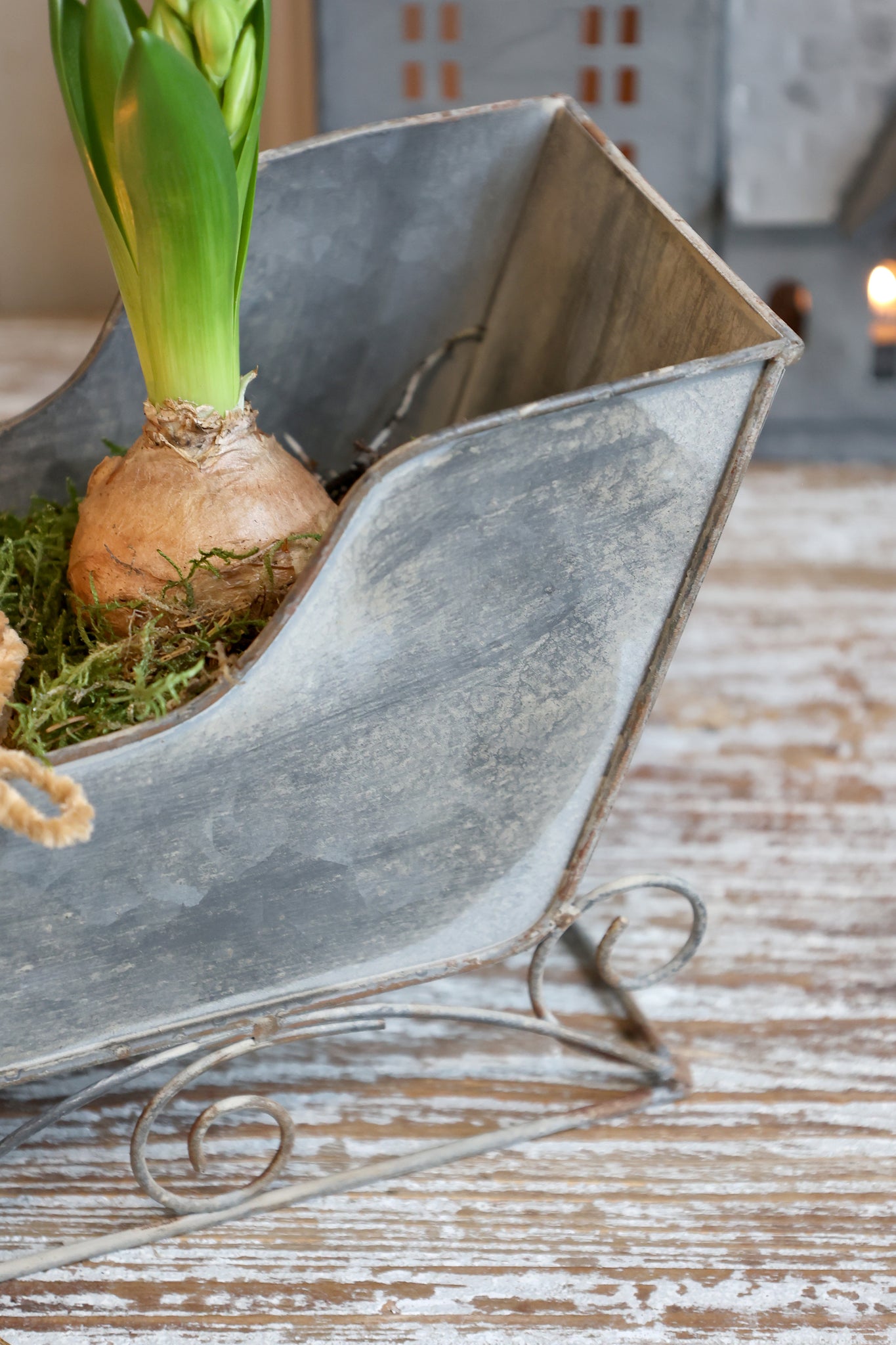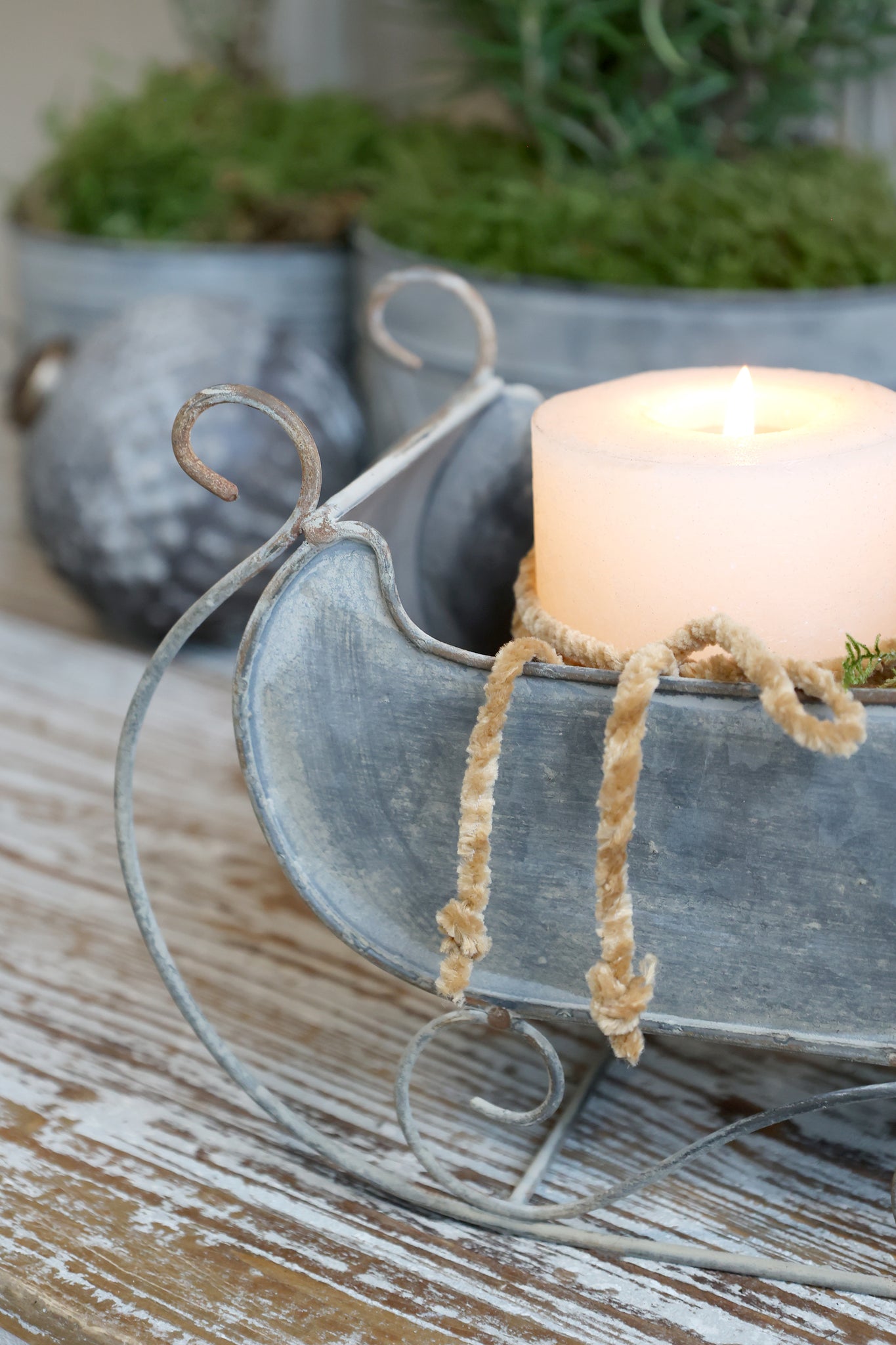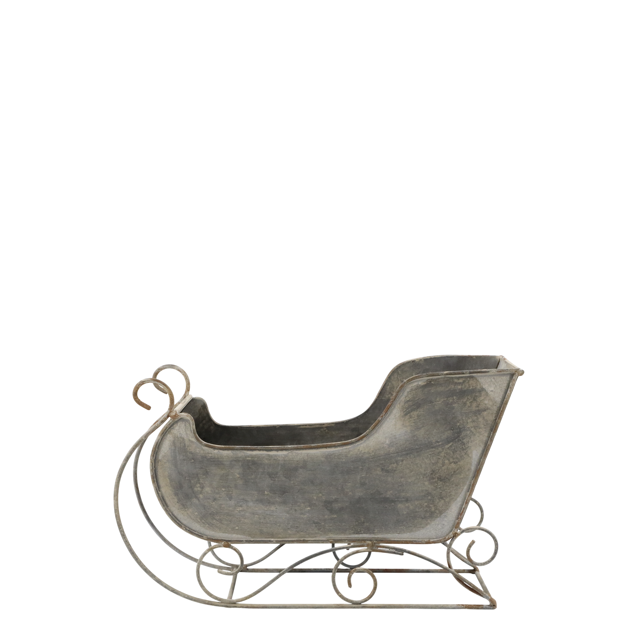 Zinc Sleigh Decoration. This metal sledge with makes a great addition to a Christmas display. Use as a seat for Christmas characters or as a table centrepiece adorned with candles or small gifts.